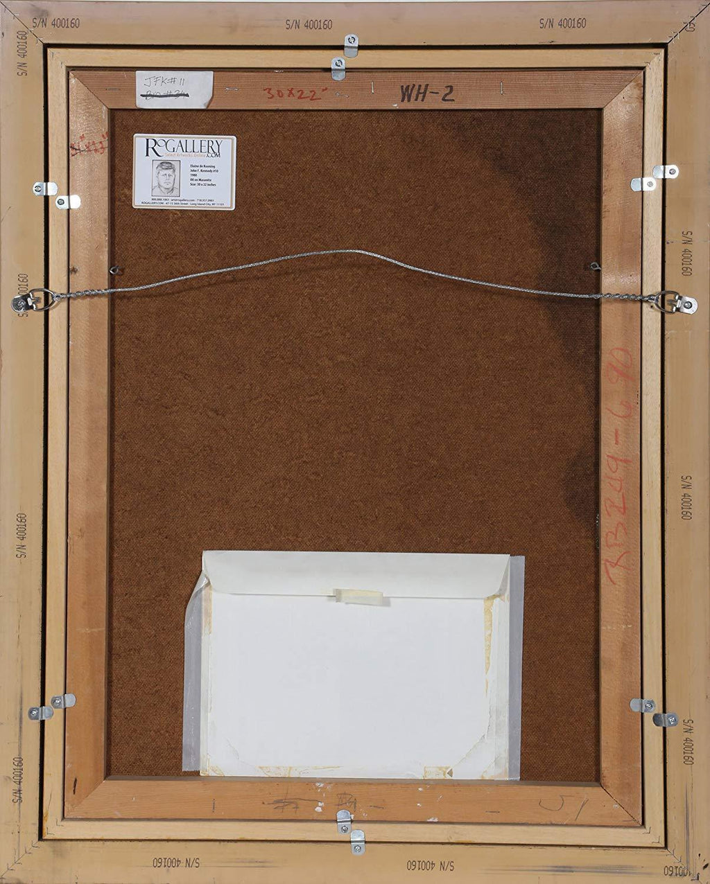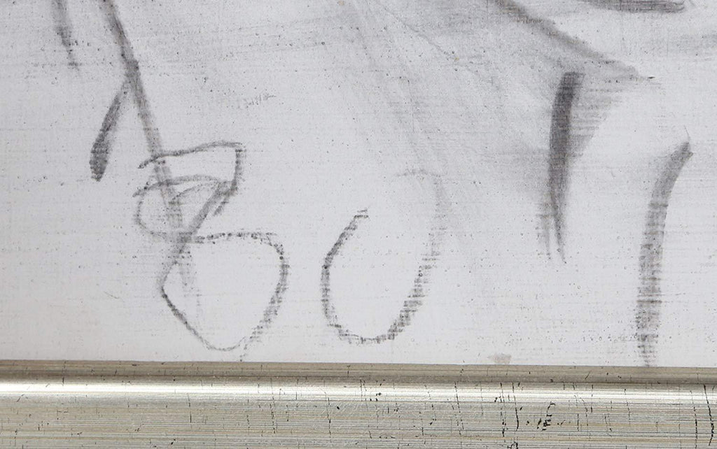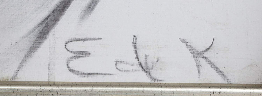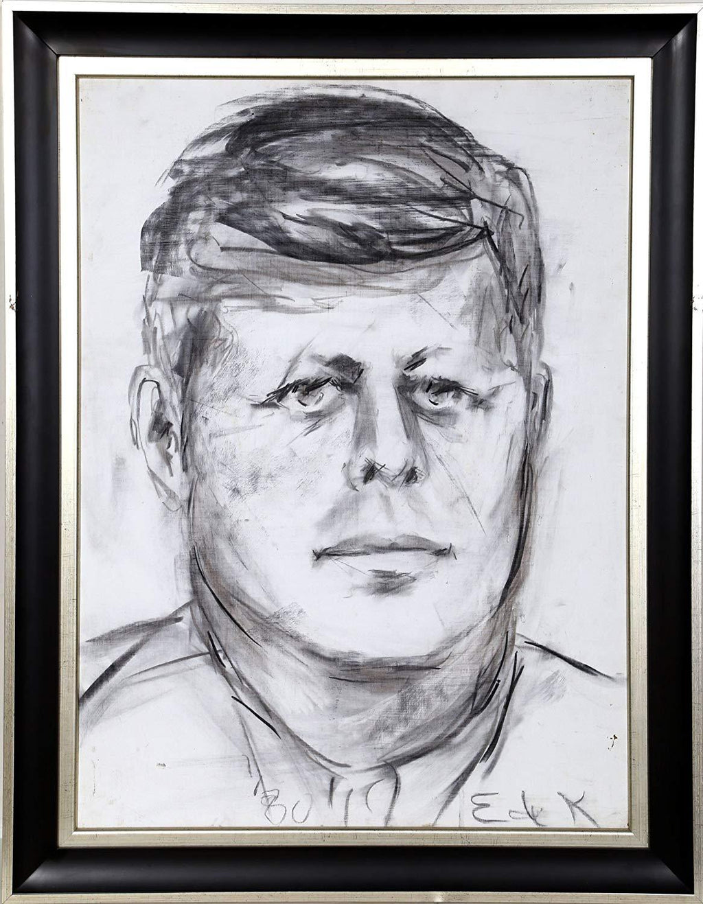 Elaine De Kooning (1920-1989) is well known for her abstract expressionism combined with semi-realism in her portraits, as seen here in "John F. Kennedy #10". President Kennedy is rendered in black and white, a simple yet expressive depiction of the late president. Elaine de Kooning was commissioned to do a portrait of the president when he was alive, but his assassination occurred before the work was finished. In reaction to the loss, de Kooning did not paint for an entire year. The wife of Willem de Kooning, the de Kooning partnership lead to some of the greatest works in modern art. This oil on masonite artwork is signed and dated, and offered in a silver and black wood frame.