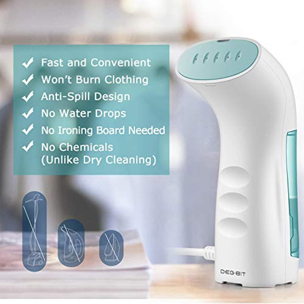 • 【New Clothes, New You】 Do you really want to use an old, musty ironing board to freshen up your business attire? Do you want to risk staining your new dress with a potentially dirty or broken iron? No way! So get a Degbit Steamer! Our portable steamer is a compact, travel-friendly tool that allows you to easily get rid of wrinkles anywhere! Ready to go in just 25 seconds and holds up to 100ml of water for 8-10 minutes of continuous steaming power. Removes wrinkles in the blink of an eye!