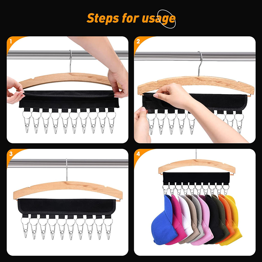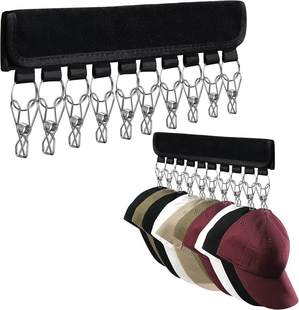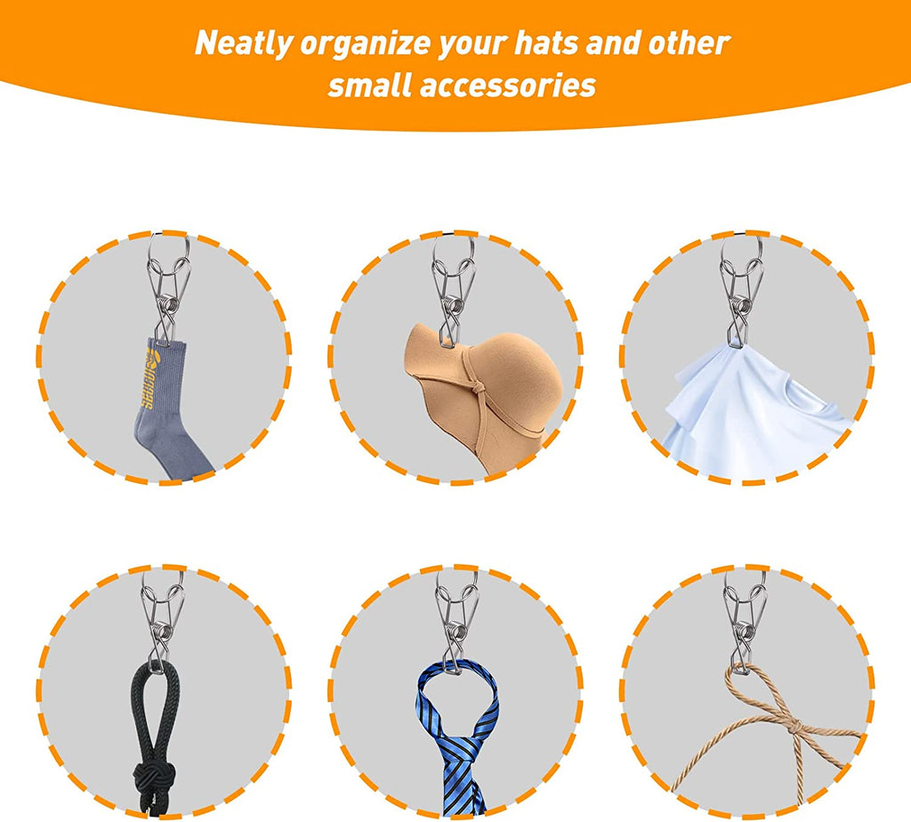 • 【Superior Craftsmanship& Long Lasting】The hat organizer are both practical and highly-functional! Our hat holders are made well sewn of high-quality polyester fabrics and sturdy durable stainless steel clips, which are durable! These hat storage clips will not leave marks on the hat. You can use it to hang your accessories, ties, belts, headbands, scarves, socks, underwear, panties, all in orderly storage.