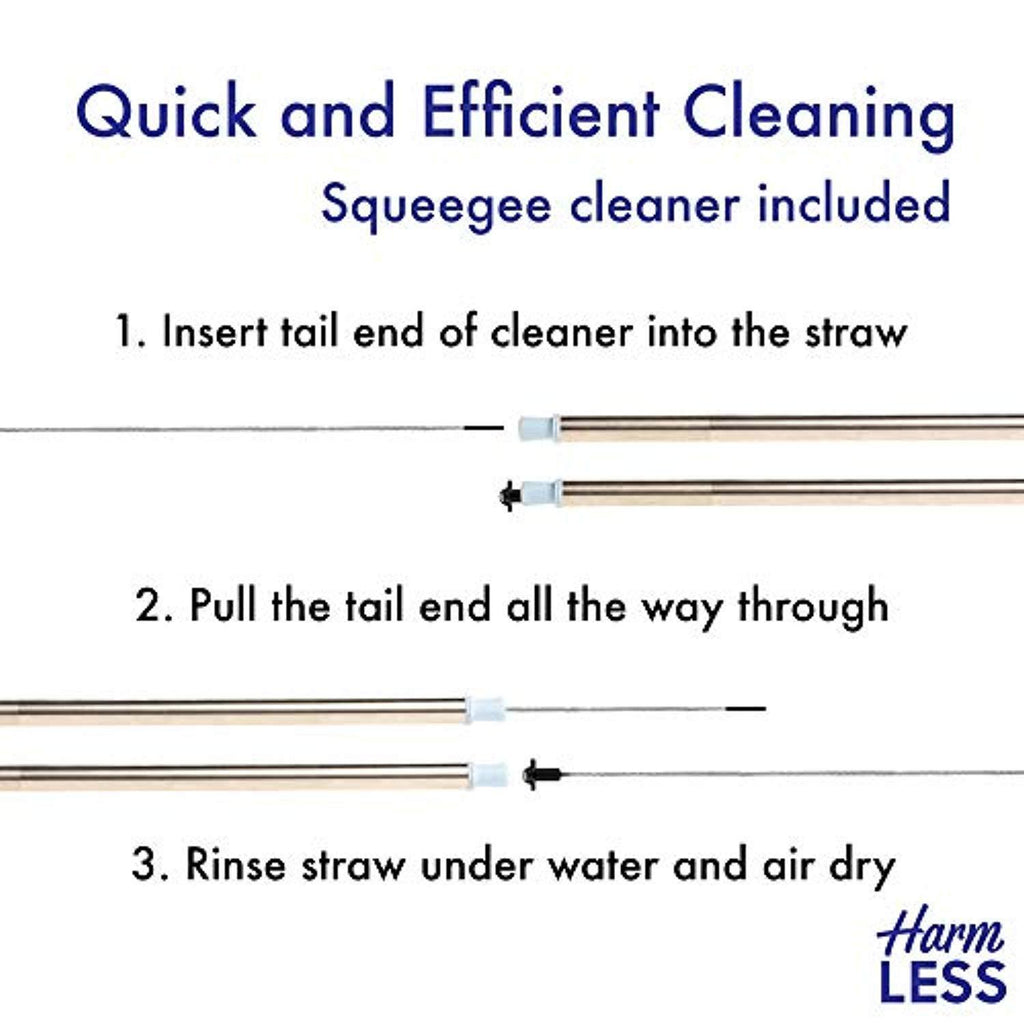• ★ EASY TO CLEAN With a portable squeegee cleaner included, it has never been easier to clean your reusable straw. Simply follow the cleaning instructions in the images above; squeegee -> rinse -> air dry or squeegee again. The massive environmental impact is enormous in comparison to the minimal effort needed.