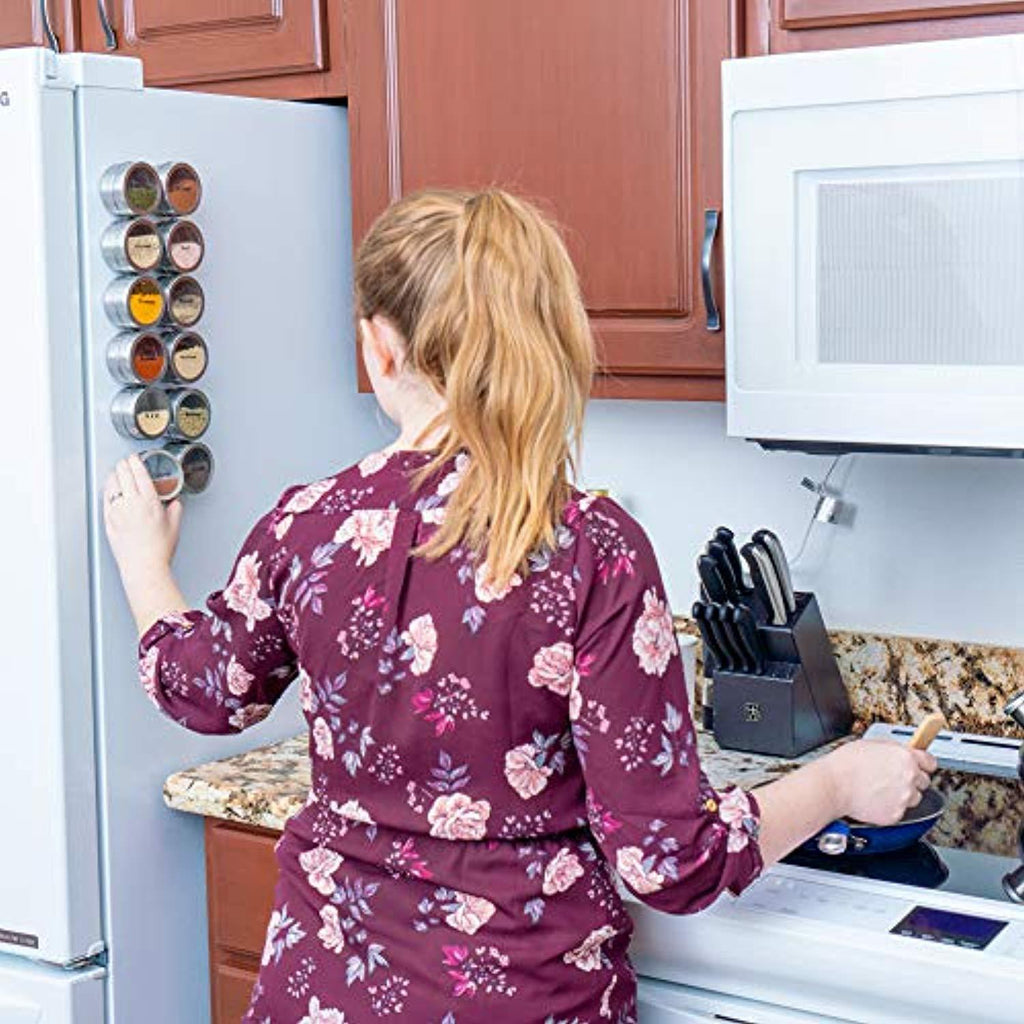 • MAKES LIFE EASIER how many times have you had to take all your spice containers off your cabinet just so you can get ONE?! This is not going to be a problem ever again! Place our magnetic tins at your most convenient place. On the side of the stove while you cook or behind your cabinet door and you'll be able to see each one of them and pick the ONE you really need to move.