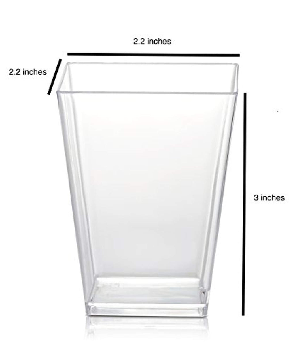 • CUPS AND SPOONS: These 5.4 oz cups and spoons are the perfect size for serving individual dessert portions, a taste of an appetizer, or hors d'oeuvres. Each cup is 3 inches tall and 2.2 inches wide and long at the top of the cup. 50 square plastic cups and 50 plastic spoons included.