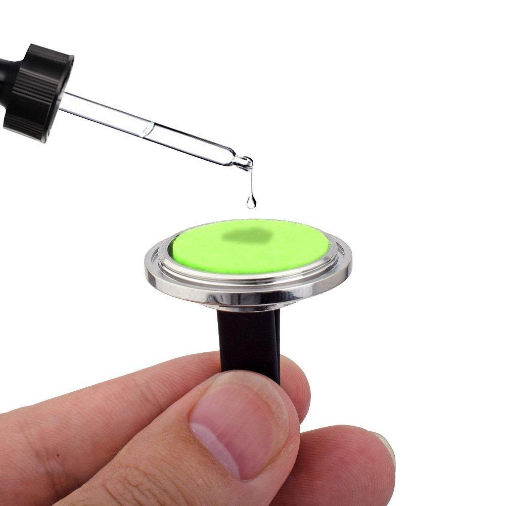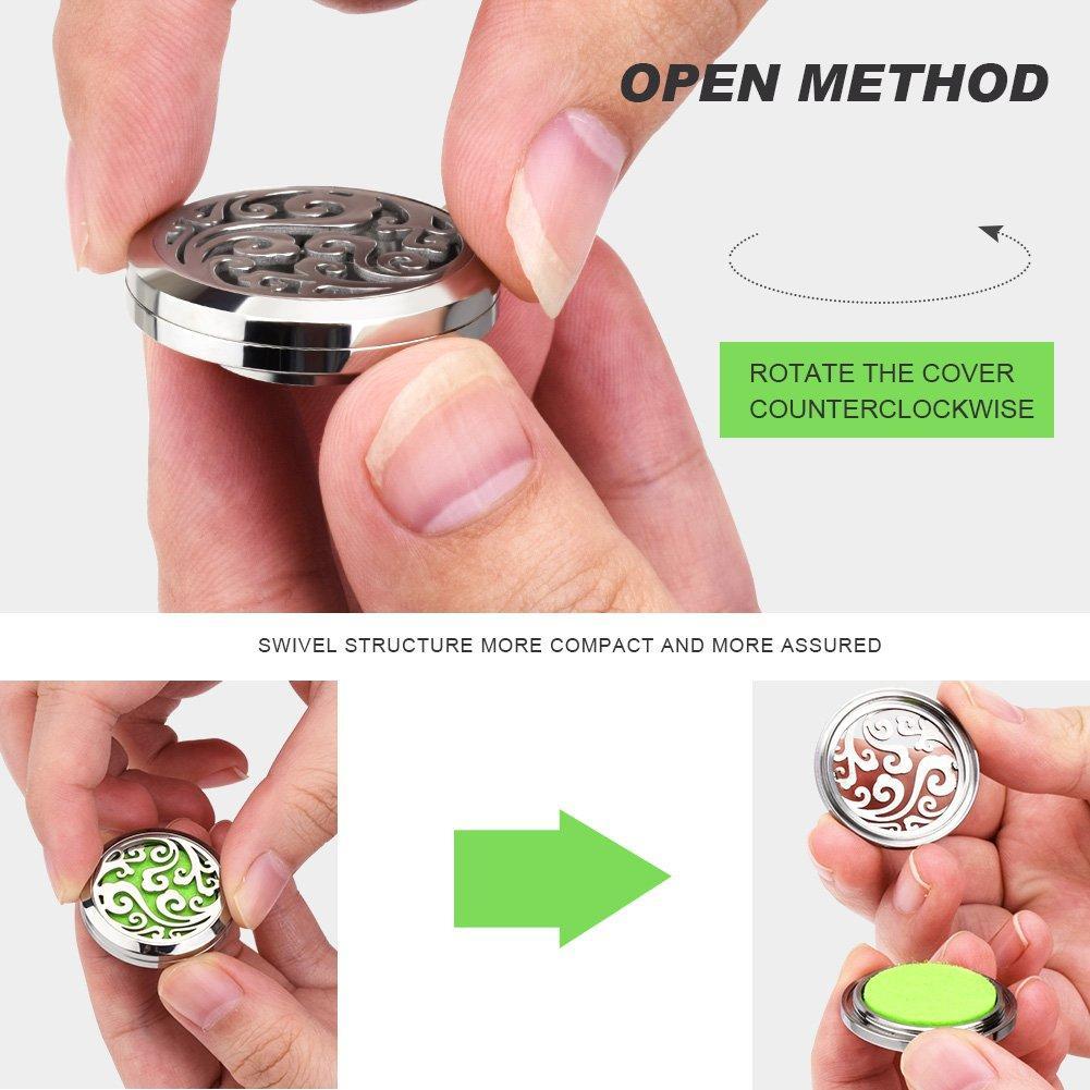• Usage: Put on some latex gloves and twist the cap counter-clock wise,apply a few drops of your favorate essential oil to one 22mm felt pad, put it inside the locket.The felt pad is washable. Rinse with ordinary detergent and dry naturally.We recommend that each pad uses the same kind of essential oil.