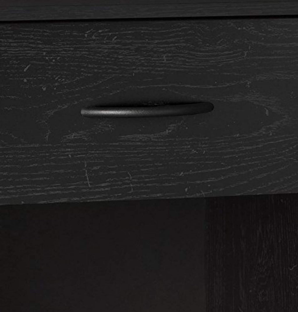 • The black with a gray woodgrain finish and decorative pulls complement the refined lines of this nightstand