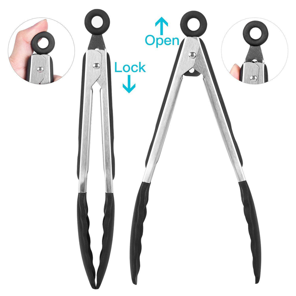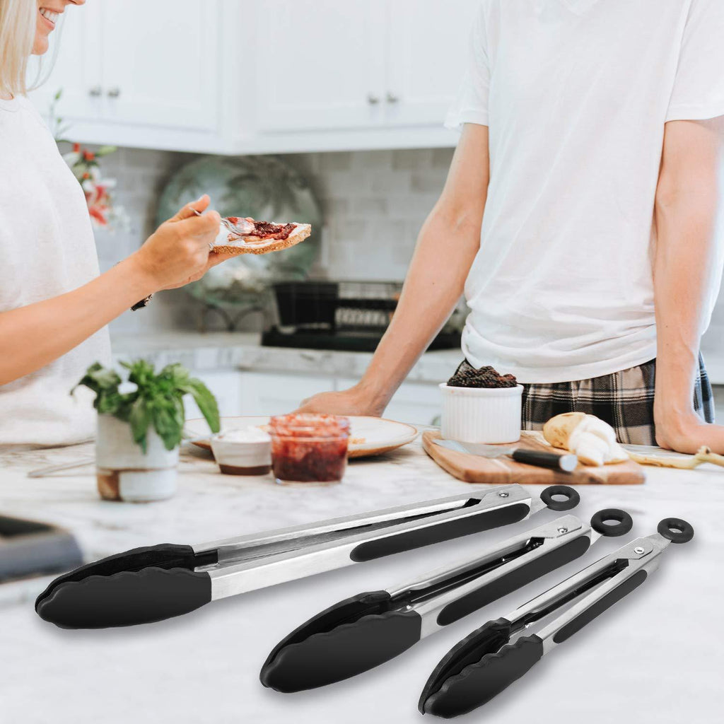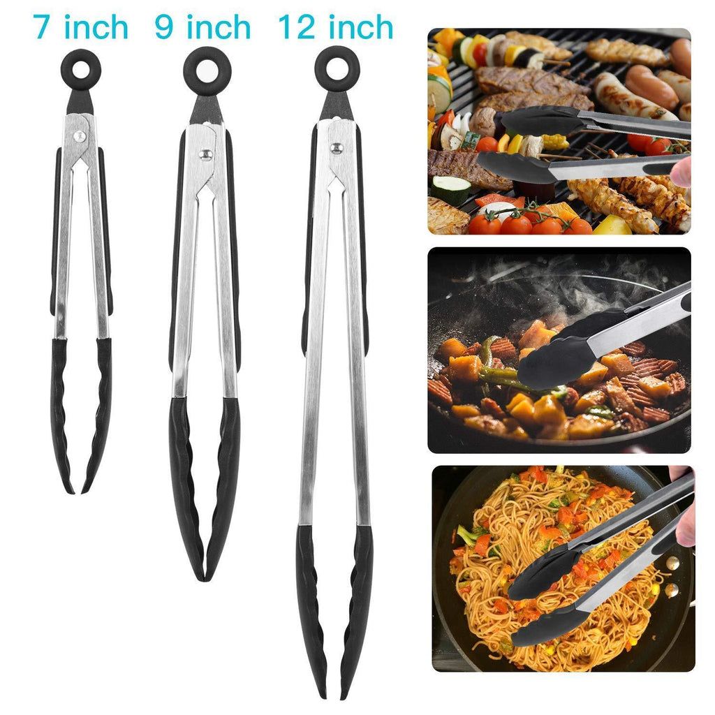 • VERSATILE AND ESSENTIAL KITCHEN SET - Set Contains: 1 x 7-Inch Tongs: 7" Handles (8" including lock) 1 x 9-Inch Tongs: 9" Handles (10" including lock) 1 x 12-Inch Tongs: 12" Handles (13" including lock).