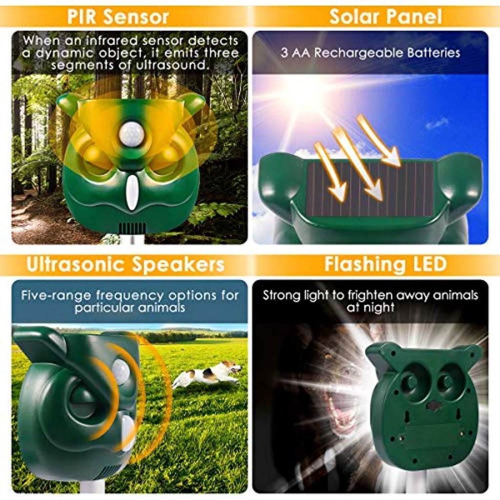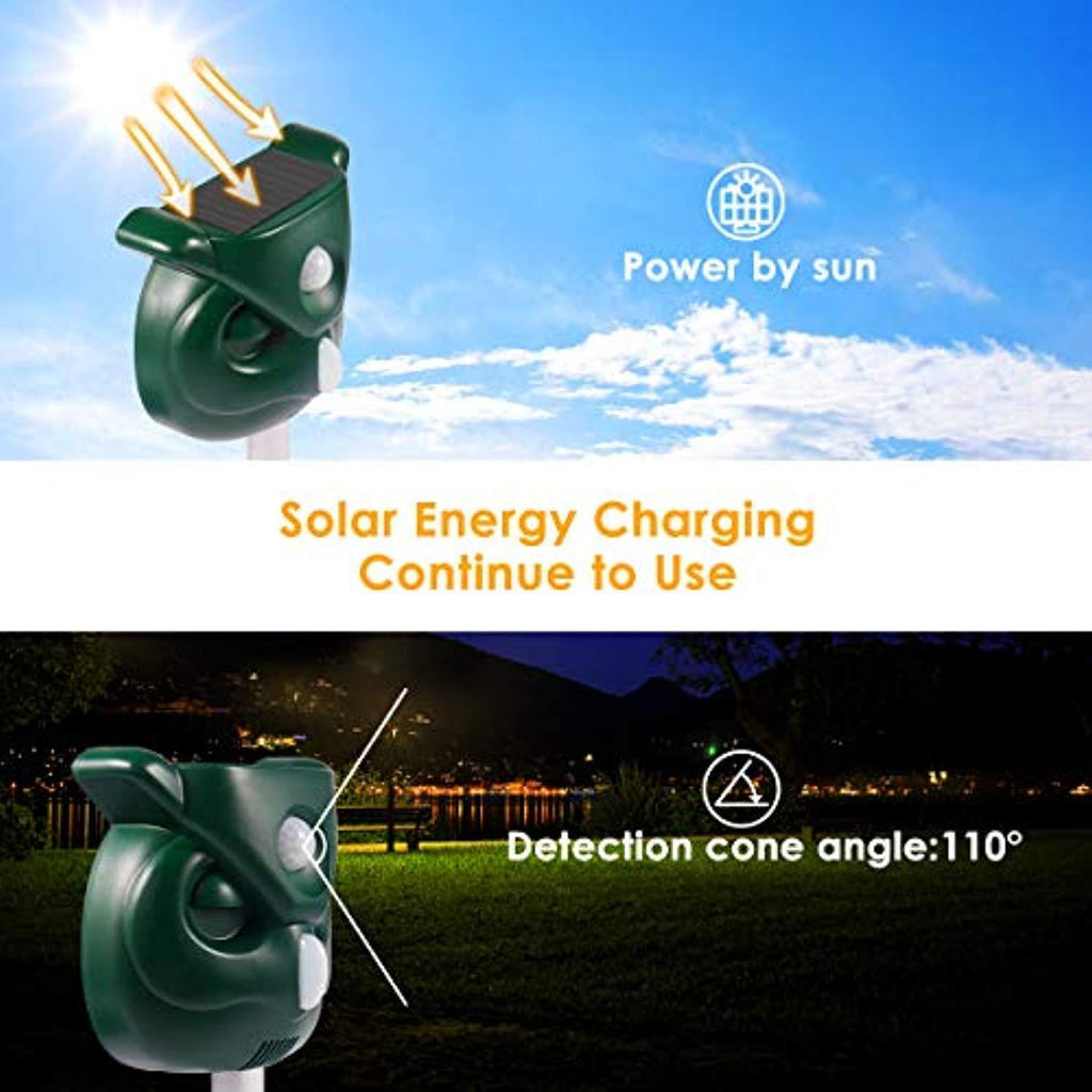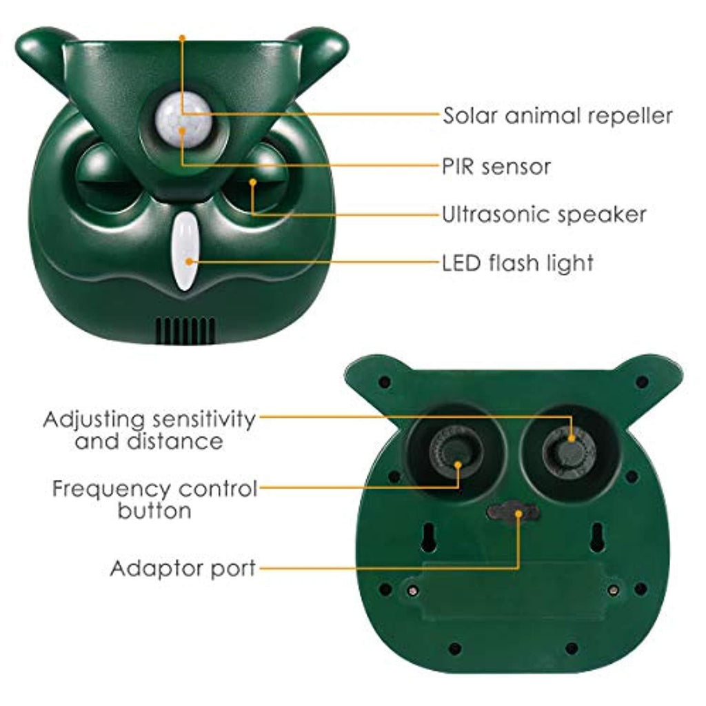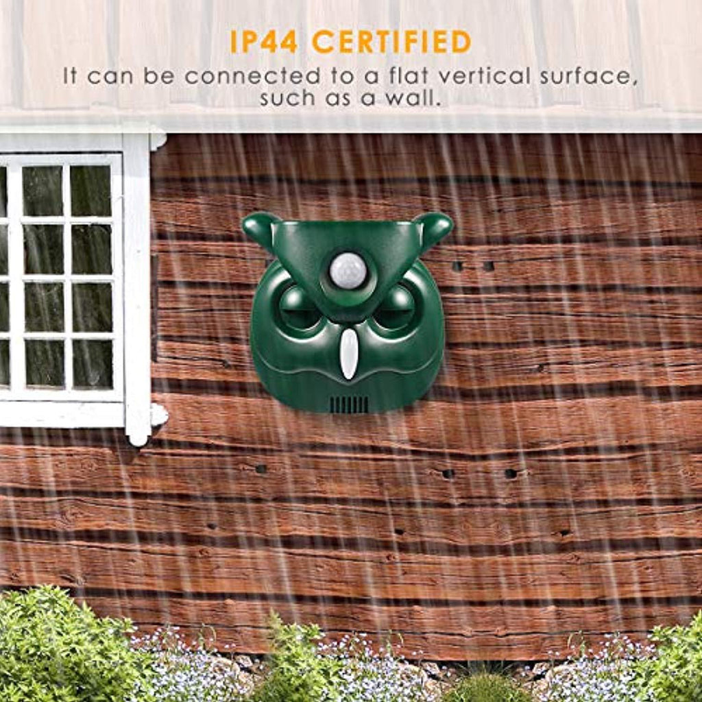 • ◆Safe & ECO-Friendly: No chemical components threatens human's health, the Passive Infrared sensor (PIR) detects motion and triggers and then the ultrasonic speaker emitting a tone that people cannot hear but chases away common outdoor pests.