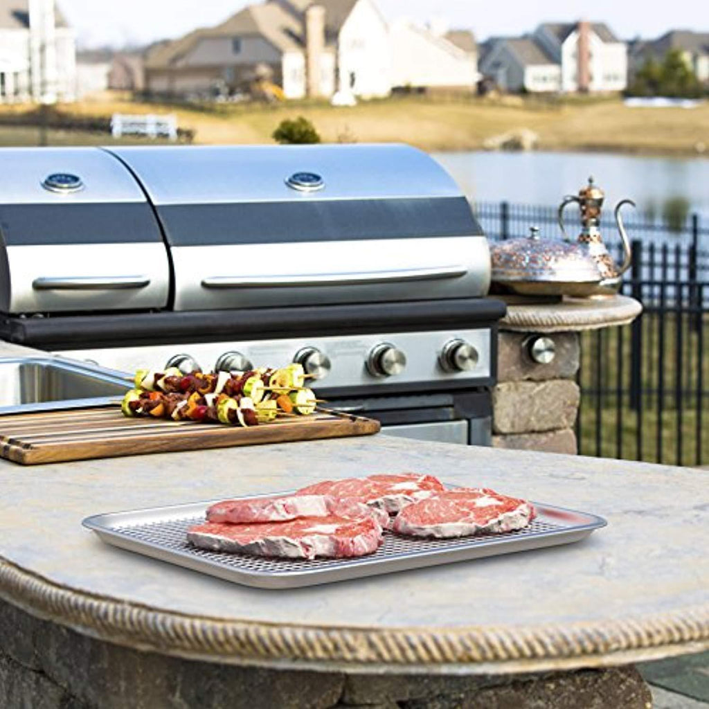 • SAFE WITH NO HARMFUL CHEMICALS or metals. The professional grade sheet pan and footed grate are approved for use in both homes and kitchens. Rest assured the units are made without harmful metals and are free of toxic chemicals, helping to keep your food healthy. The all-around high-quality baking tray measures 12-1/4 inches x 17-1/8 inches and will instantly become a deeply treasured part of your kitchen. Proudly serving large and small groups.