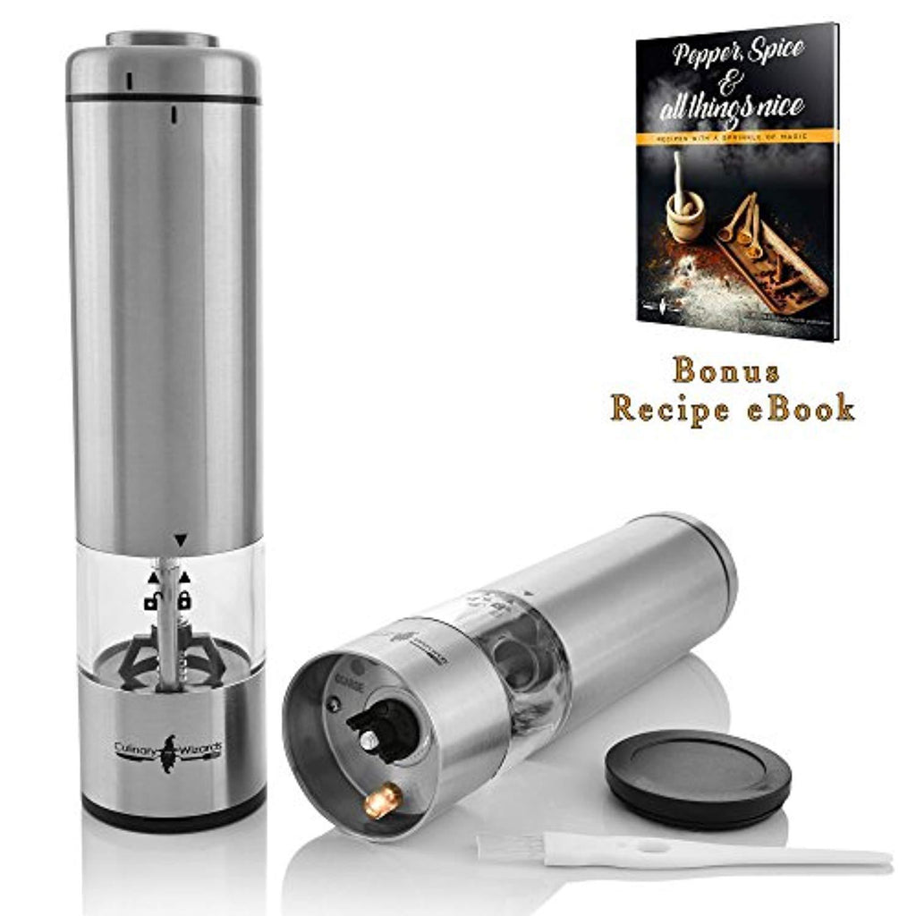 • TOUCH BUTTON STYLE; The Perfect Gift for any food lover. The Culinary Wizards Electric Salt and Pepper grinders bring a touch of magic to your kitchen. Sleek design, produced with the highest quality brushed stainless steel body with transparent acrylic refill chamber and ceramic grinding core, not only do they make your life easier, they have a high end look and feel with an instant WOW factor.