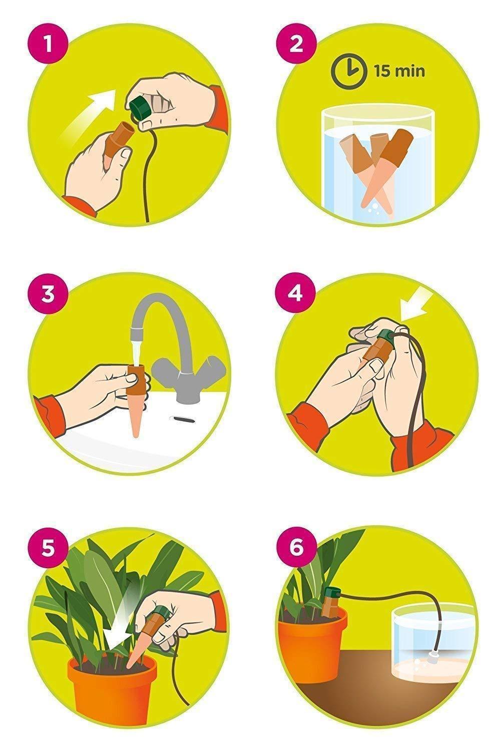 Take a vacation and let your plants look after themselves with authentic Austrian-engineered Blumat Juniors. These are the Original Blumats and are superior in design, material quality, and durability to counterfeit products. After years of testing, Blumat has created one of the most efficient and reliable automatic watering devices on the market. The ceramic cone is porous and allows water to be absorbed and released when placed in wet and dry mediums, respectively. As water is drawn from the cone and into the growing medium this creates a vacuum which draws water from the nearby container of water. For tropical plants or plants that need more water, raise the reservoir to create additional head pressure (water pressure resulting from gravity), thus increasing the flow of the water. For cactus or plants that need less water, lower the reservoir to even with the plant to only allow watering when the medium is almost completely dry. Since the ceramic cone only releases small amounts of water slowly, your plants will not experience over watering (which can drown the plant) or under watering (which can result in stunted growth and root damage) thus encouraging prolific growth in all plants! Blumat Juniors will only draw water up to 12 inches from below the cone. If the surface of the water in your reservoir is lower, the flow of water will be restricted and the plants will dry out. In some cases, several cones may be necessary for larger plants to meet higher water needs. In this case, a larger reservoir should be used. Instructions: 1. Fill a bowl with water. Remove the top of the Blumat. Put both the into the bowl for at least 15 minutes. 2. Holding the cone and cap underwater, knock out the air bubbles and press the top on tightly. 3. Push the ceramic cone into the soil. 4. Put the hose at the bottom of the container of water. Add liquid fertilizer if necessary.