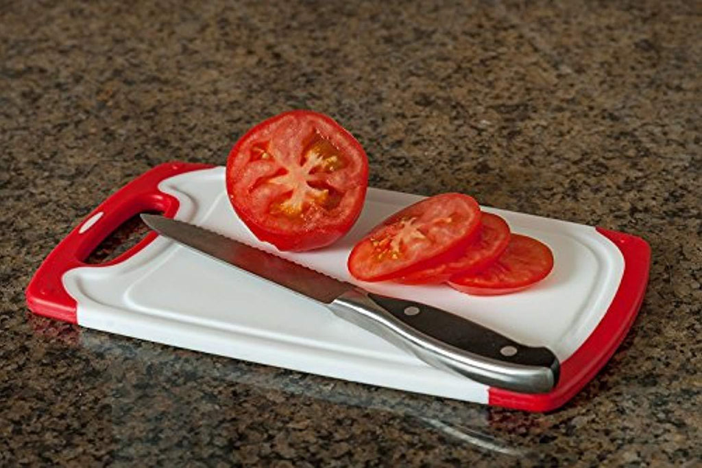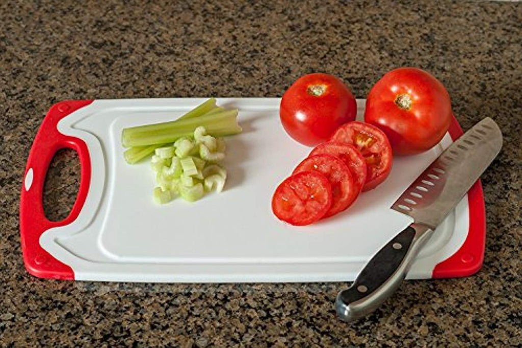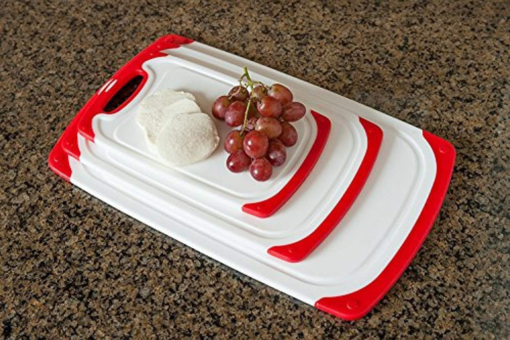 CC Boards 3-Piece Nonslip Cutting Board Set: Red and white plastic kitchen carving boards, each with juice groove and nonskid handle; dishwasher safe