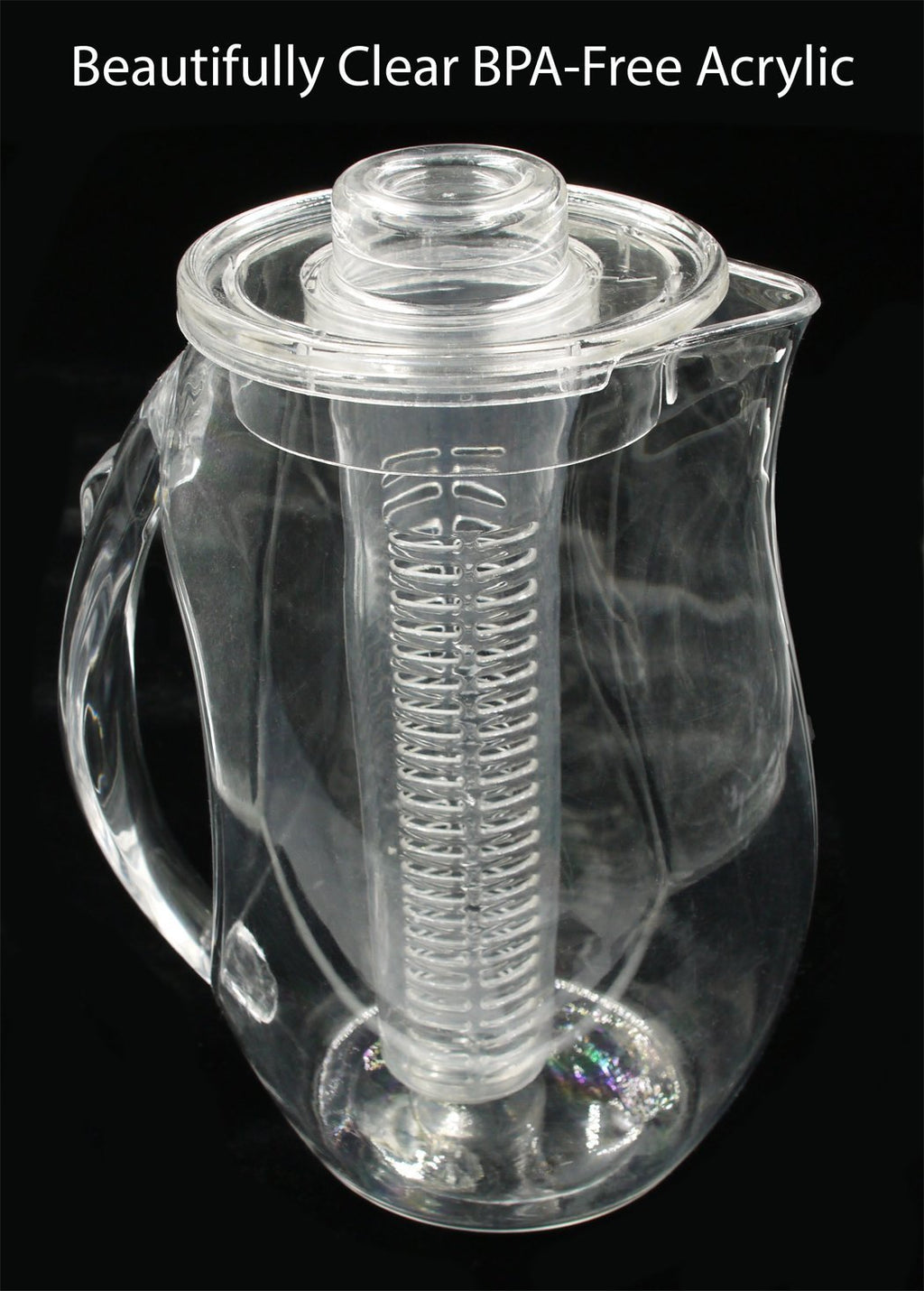 • BEAUTIFUL CRYSTAL CLEAR BPA-FREE ACRYLIC PITCHER. Includes removable hollow, fruit core that could be filled with fruit, vegetables and herbs. The hollow rod has open slots which allow the flavors to infuse with water. Includes free ice core so you can cool your favorite drinks without diluting the flavors.