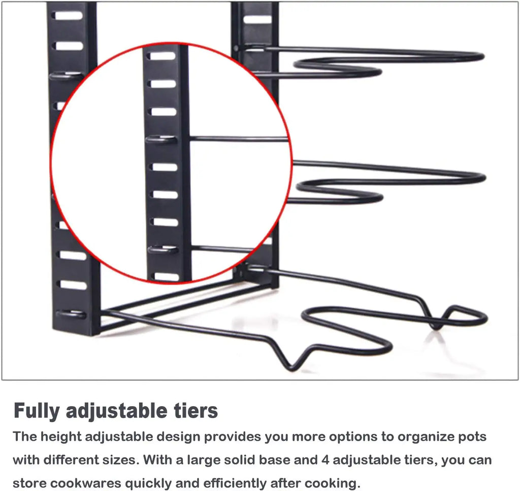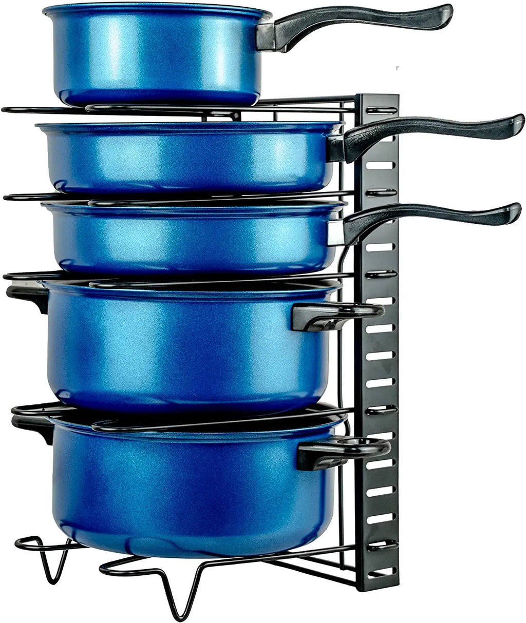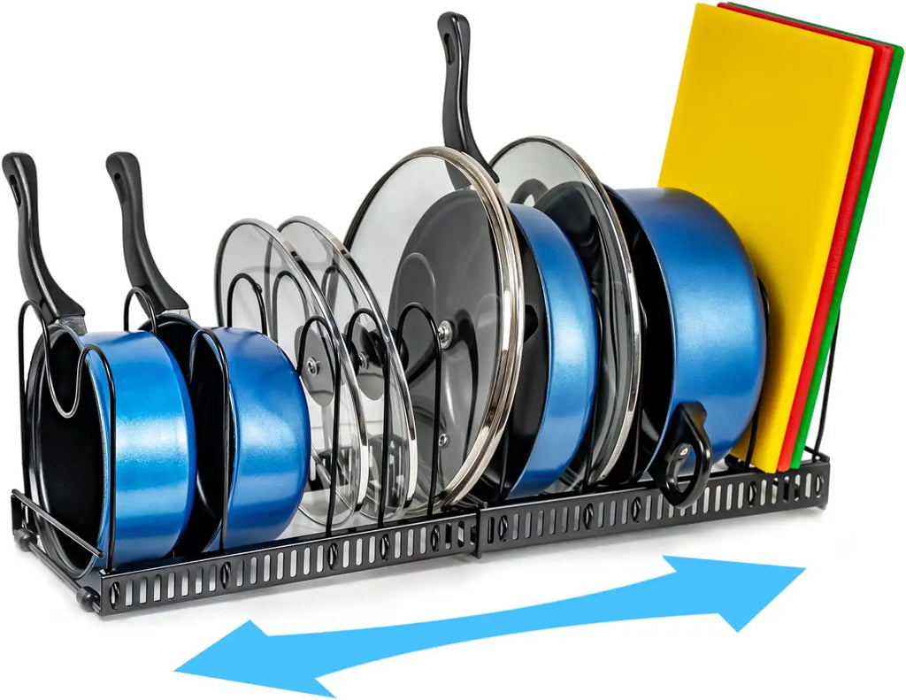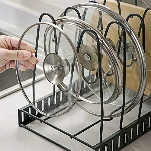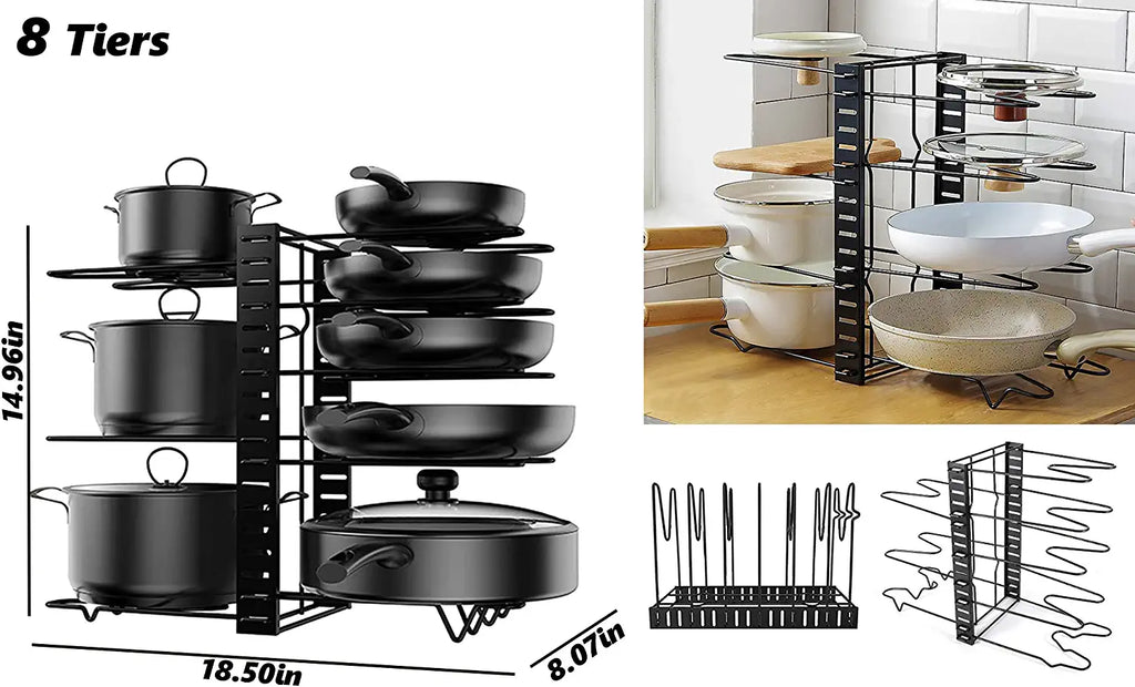 • 【Superb Design】: The pot organizer rack shop for up to 8 pots. Arrange your pots, pans, platters and more, most lids with this versatile rack can be used vertically or horizontally on your kitchen counter or in your cupboards