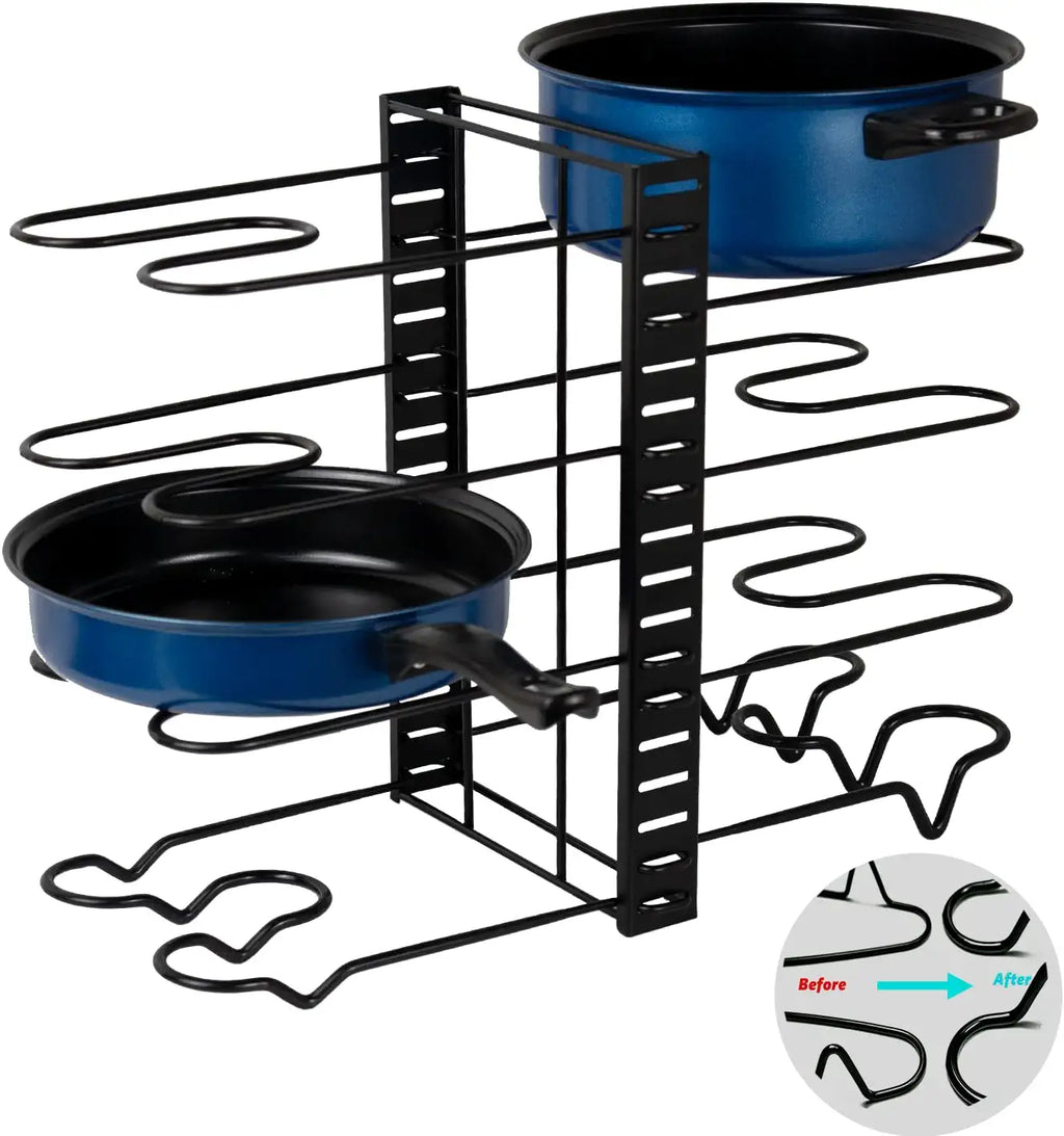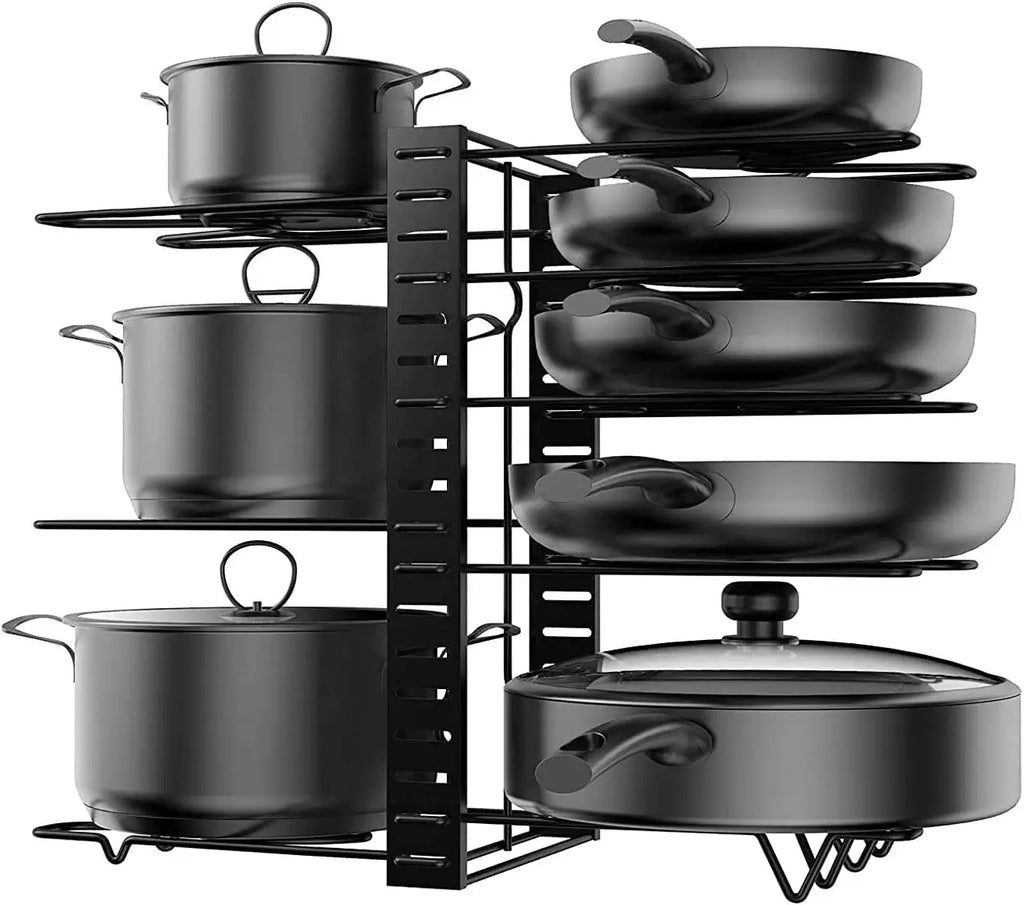 Chicwe&Kleverise 8 Tiers Pot Pan Storage Rack Organizers – Heavy Duty Cast Iron Adjustable DIY Pot Pan Rack - Pot Pan Lid Holders - Space Saving Rack in Kitchen Counter and Cabinet