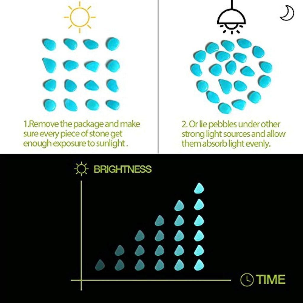 • ECO-FRIENDLY -- Scatter these pebbles exposure directly to full sunlight (or strong light) for 2 - 3 hours, they can light up beautifully in the dark and maintain glowing for 3 - 5 hours. The more they absorbed, the more they glow.