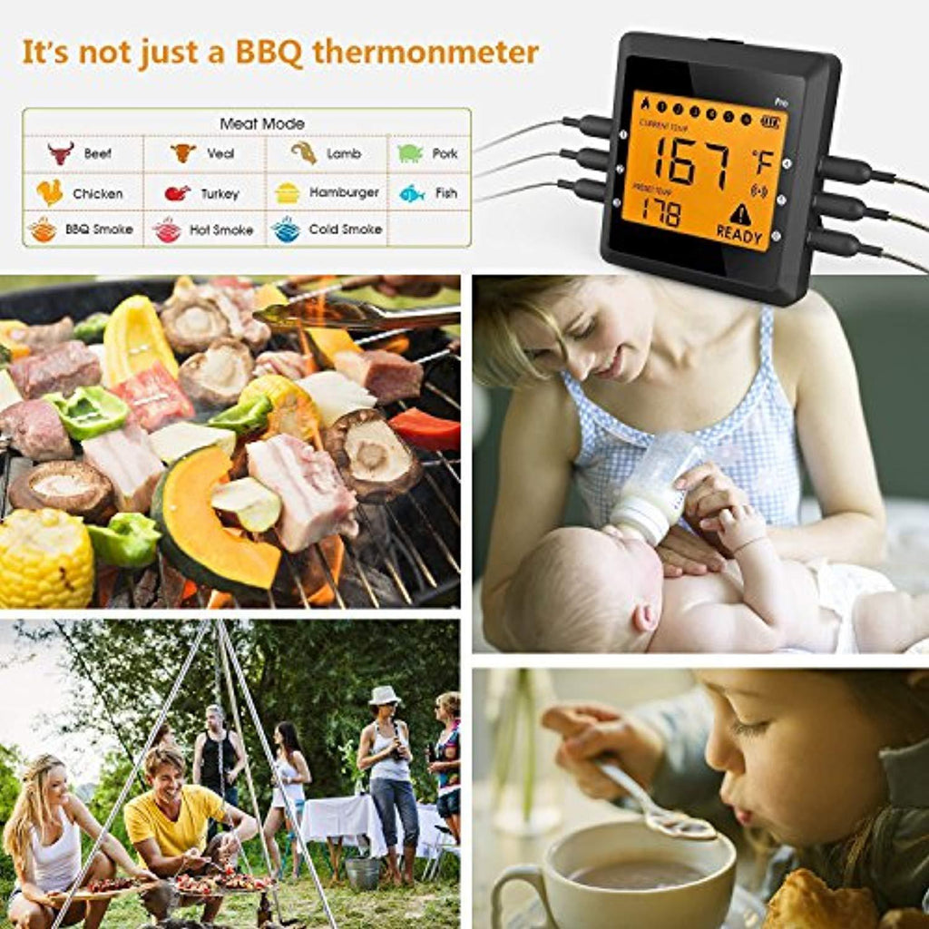 • ♥6 CHANNEL PROBES SIMULTANEOUSLY MONITORING ♥This instant read meat thermometer has 6 FOOD GRADE stainless steel probes, which can monitor different meats or grill/smoker temperature same time, 4" food grade stainless steel probe with silicone handle keeps you from burning your hands while measuring.features step-down tip design to get temperature more precisely and quickly.