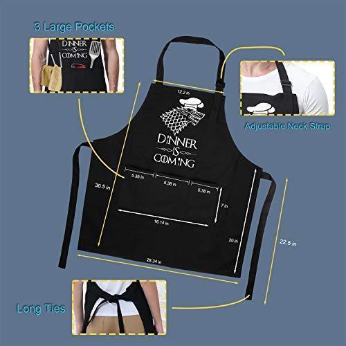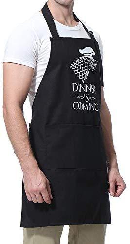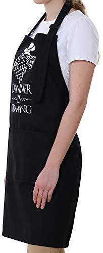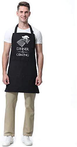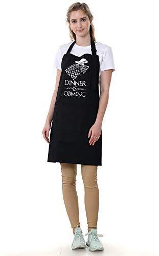 • CUTE APRONS FOR GOT FANS: This GoT inspired saying “Dinner is coming” apron is the perfect cooking gift for the Big GoT cook who loves to grill. Ideal for chef, grill master, baker, waiter, waitress, restaurateur, your mom, mother in law, dad, hubby, fiancée, wife, husband, nanny, grandma, grandpa, yourself, best friends, BFF, girlfriend, boyfriend, sisters, sister in law, brother, brother in law, daughter, son, cousin, aunt, uncle, co-workers, neighbor or any cook lover in your life.