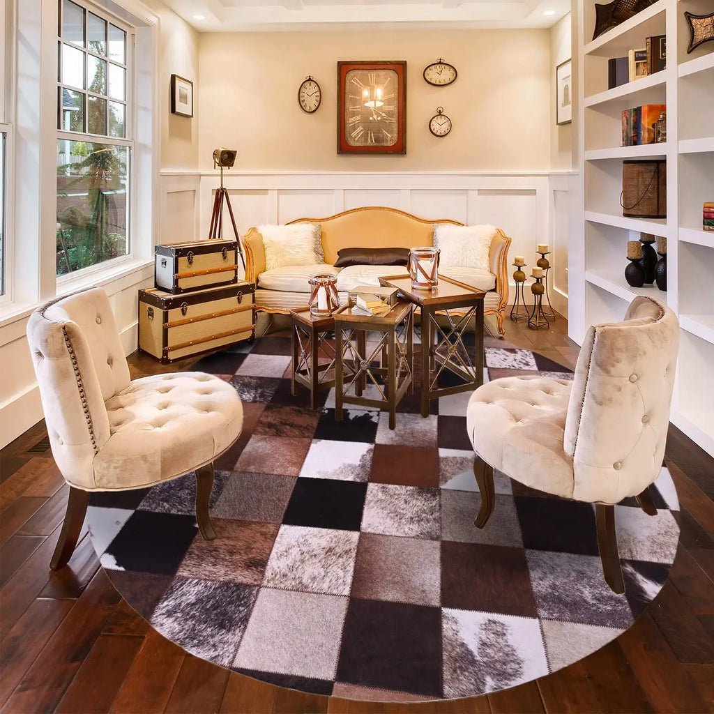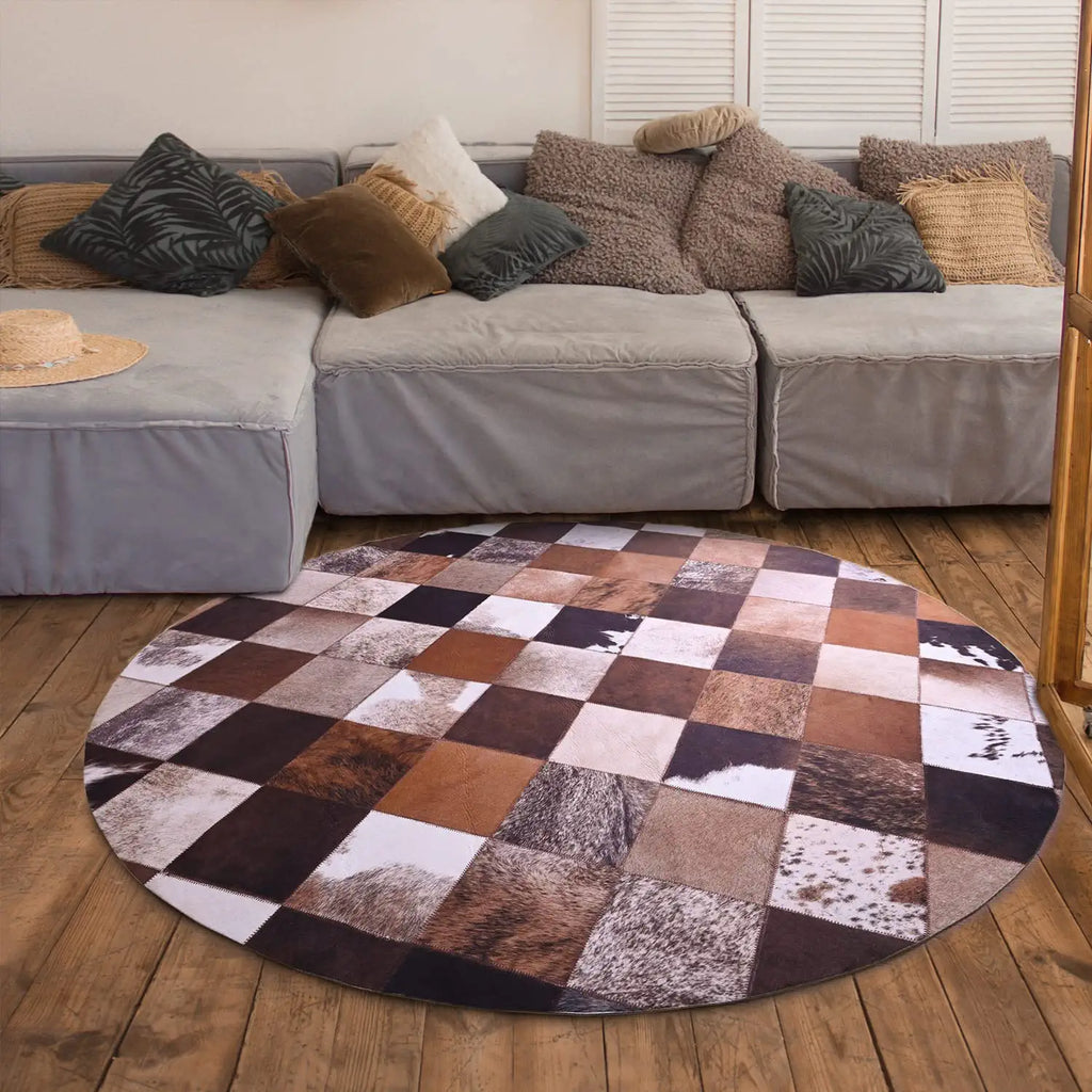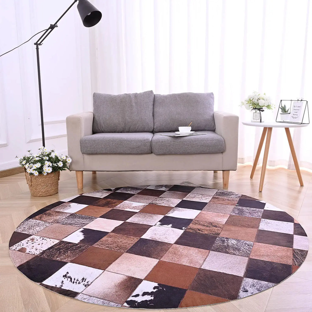 DweIke Faux Cowhide Rug, Round Rug 5 x 5ft/153*153cm, Large Size Faux Fur Animal Cow Print Carpet for Bedroom, Living Room, Office, Home Decor Mat, Cowhide Rug, Brown