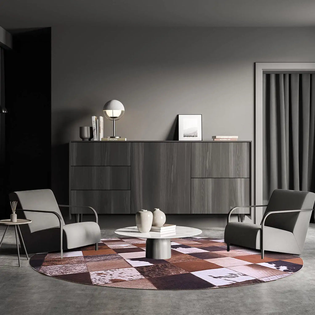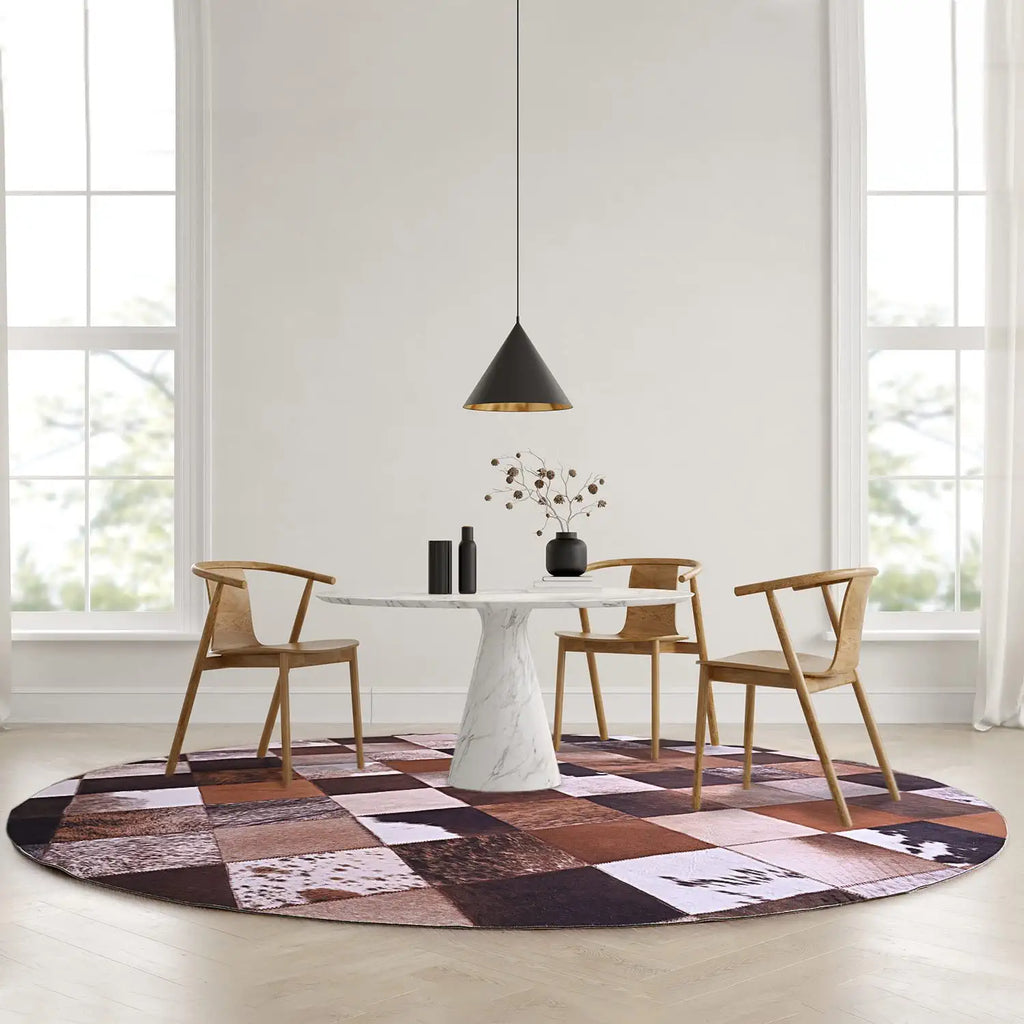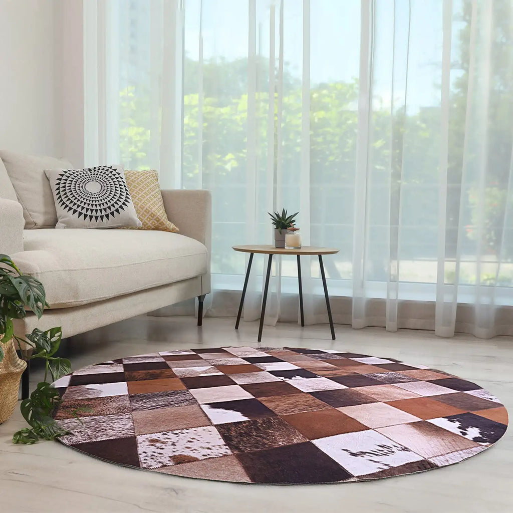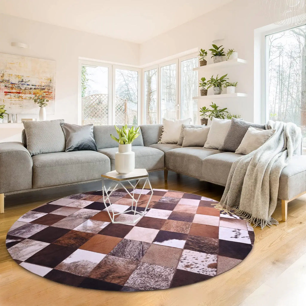 DweIke Faux Cowhide Rug, Round Rug 5 x 5ft/153*153cm, Large Size Faux Fur Animal Cow Print Carpet for Bedroom, Living Room, Office, Home Decor Mat, Cowhide Rug, Brown