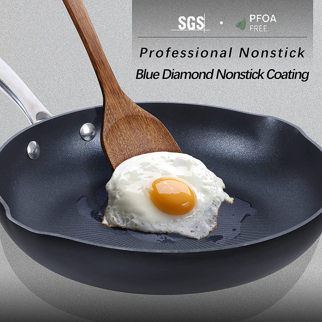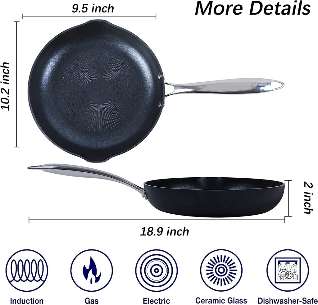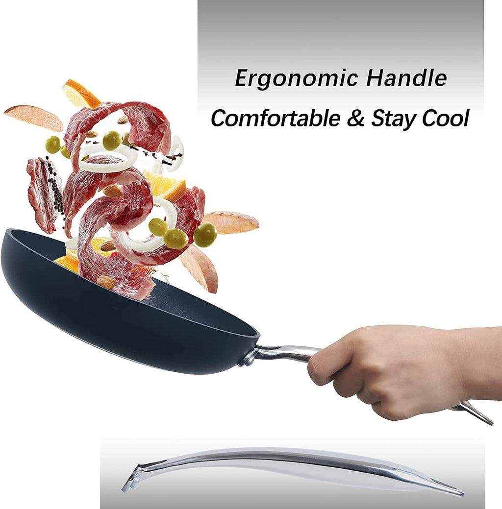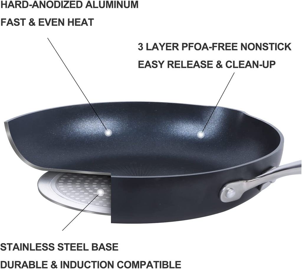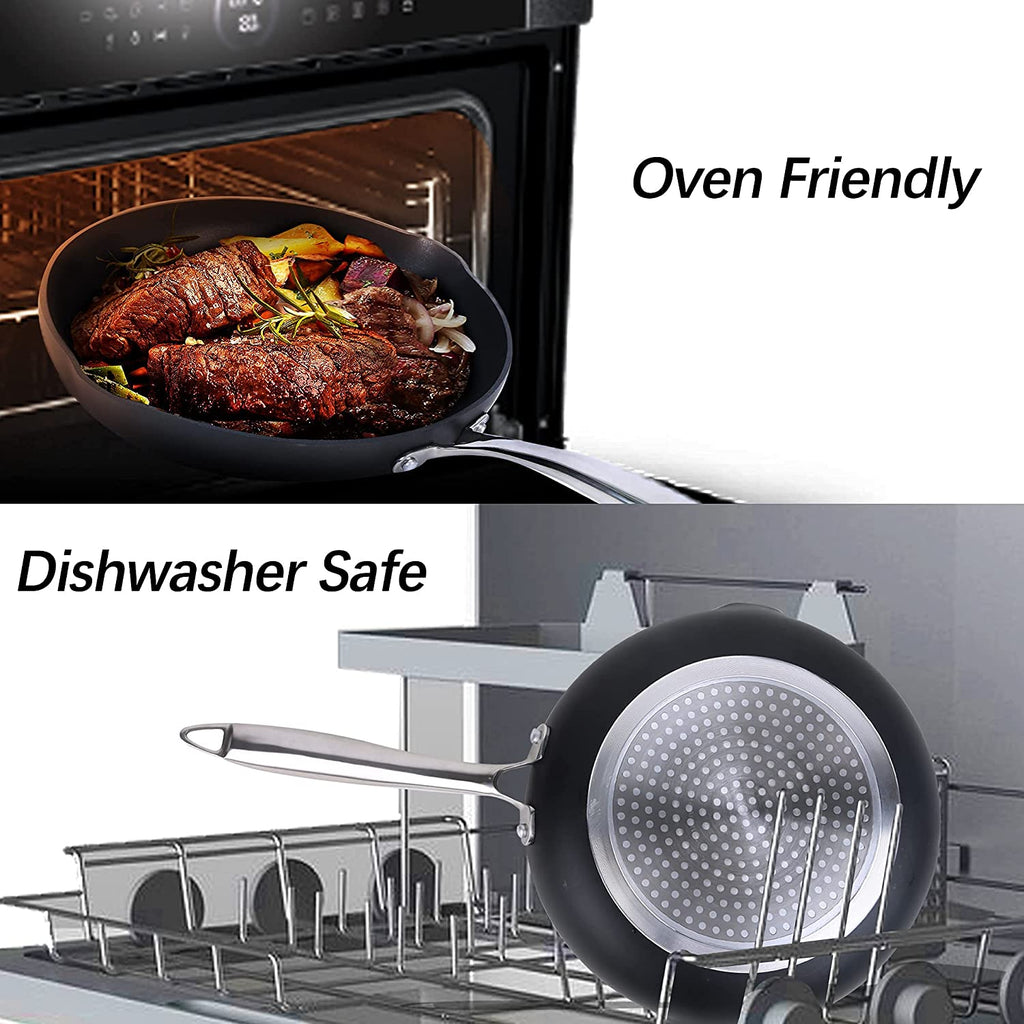 • Unrivaled Durable - Our nonstick pan is crafted from hard-anodized aluminum, which allows our nonstick cookware to quickly transfer heat and use less oil, achieving years of performance.