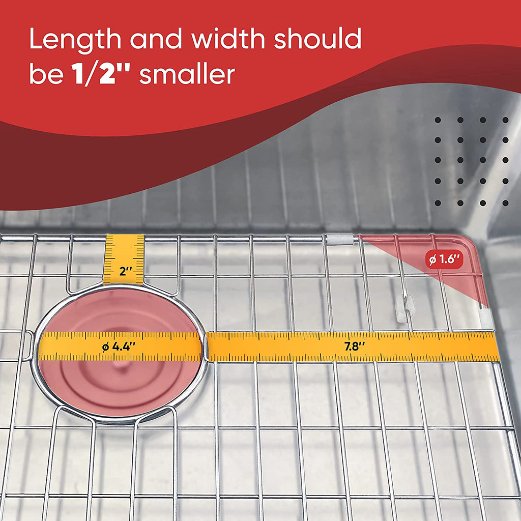 • CHECK DIMENSIONS OF STAINLESS STEEL RACK: measure 1'' from the bottom inside of your sink. The length and the width should be 1/2'' smaller than sink protector size. IMPORTANT: сheck the dimensions before buying!