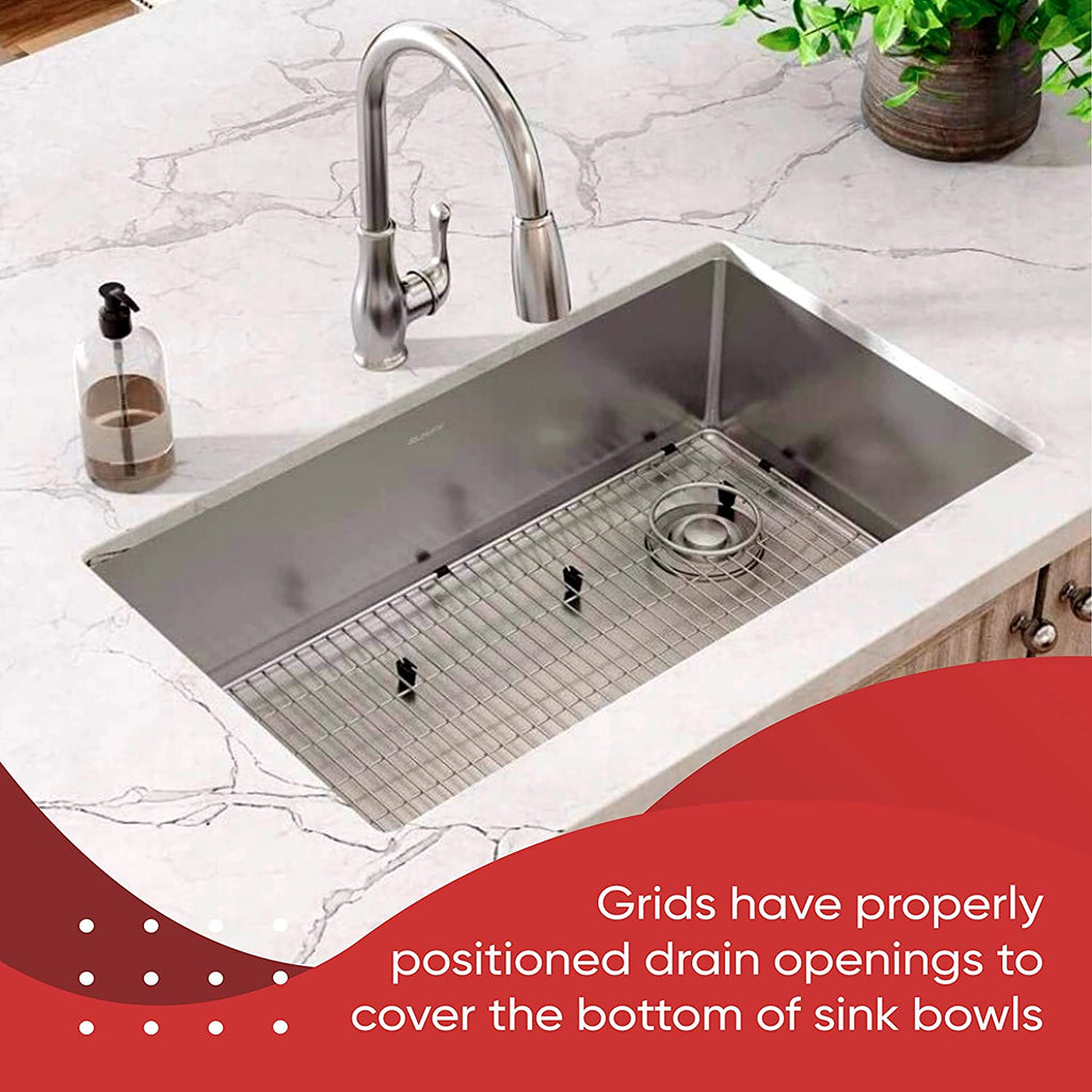 • LONG-LASTING DESIGN: rugged construction of kitchen sink bottom grid is made with rust-resistant stainless steel. The soft bumpers are non-slip and perfectly hold the grid in place, protecting the bottom of the sink.