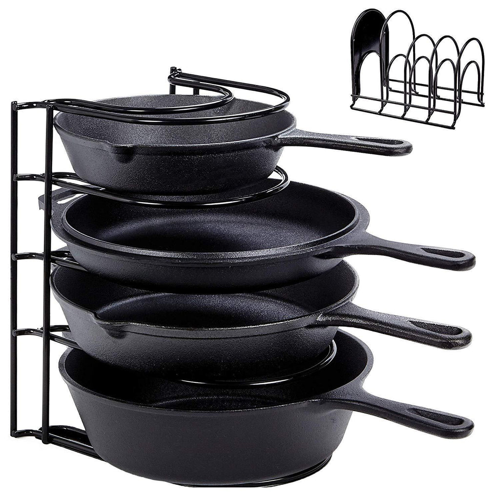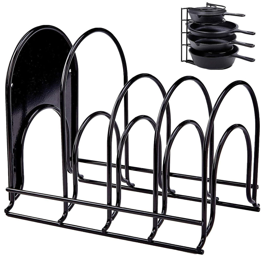• HEAVY DUTY CONSTRUCTION: Designed to hold even your heaviest cast iron pans, the strong metal ensures your pan organizer will be a lifetime investment. Durable and built to last, this rack can handle anything!