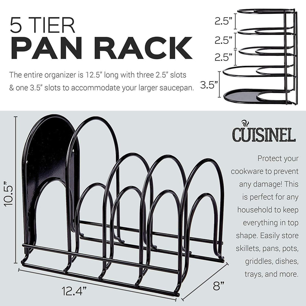 • 5 TIER DESIGN: The entire organizer is 12.5” long with three 2.5” slots and one 3.5” slots to accommodate your larger saucepan. You can easily stack smaller pans and skillets within one slot to save more space.