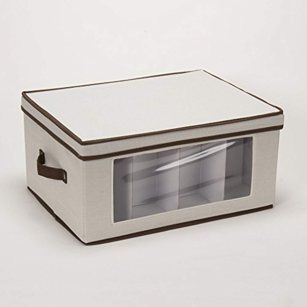 Household Essentials 542 Vision Storage Box with Lid and Handles | Wine and Balloon-Style Glasses | Natural Canvas with Brown Trim