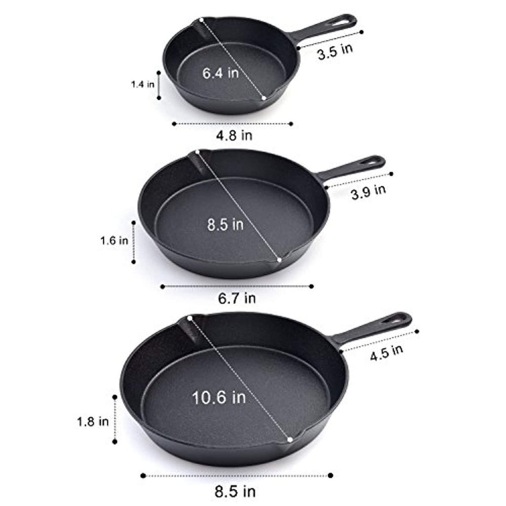 • INCLUDES: This classic kit combines 6”, 8” & 10” cast iron skillets are a timeless must-have for every kitchen. Can sauté, sear, fry, bake and stir fry. Each handle with the hole at the end for convenient hanging storage when not in use.
