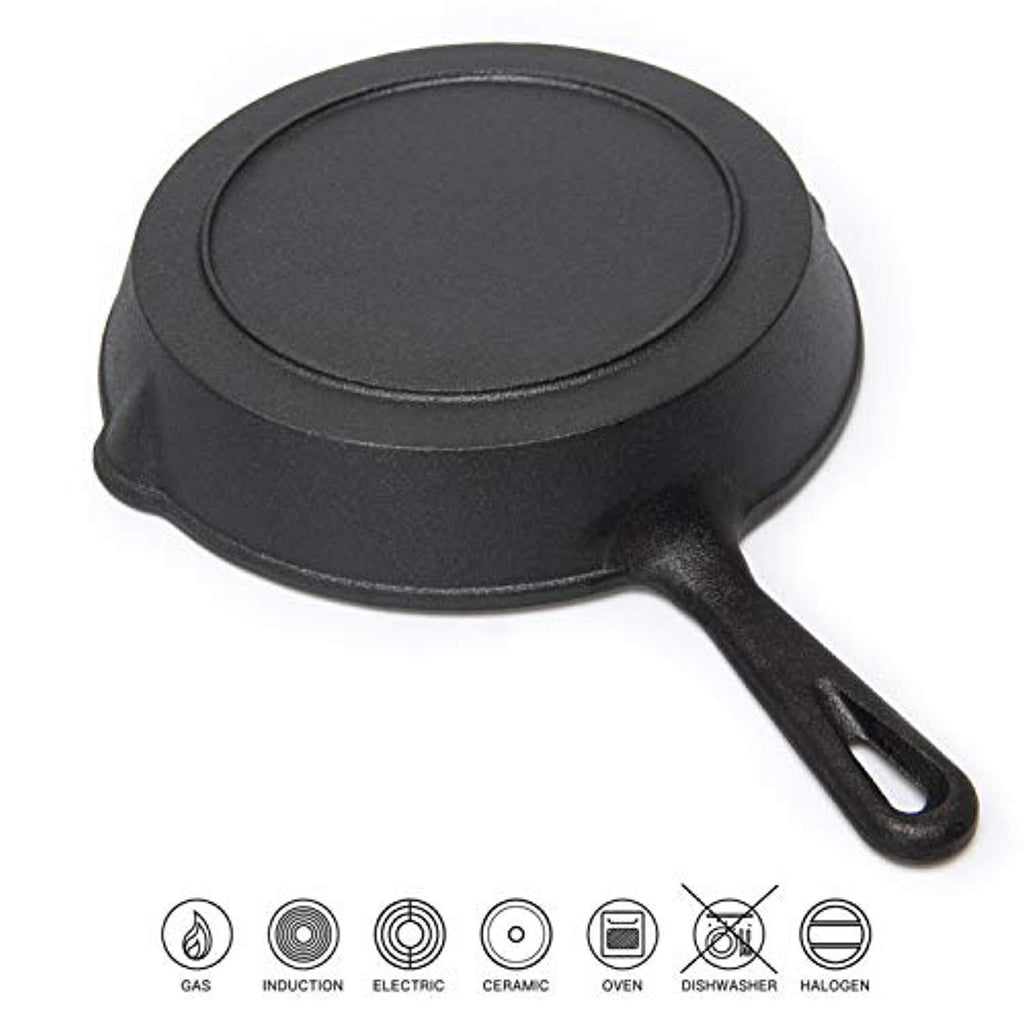 • SUITABLE FOR: HUFTGOLD pre-seasoned cast iron skillets are suitable for all kinds of burners including gas, electric, ceramic, halogen, radiant, induction, oven and ranges fired by gas, oil, coal or wood. When finished cooking, wash with hot water and a sponge or stiff brush. (NOTE: cast iron pans are NOT intended to be used in a dishwasher and microwave)