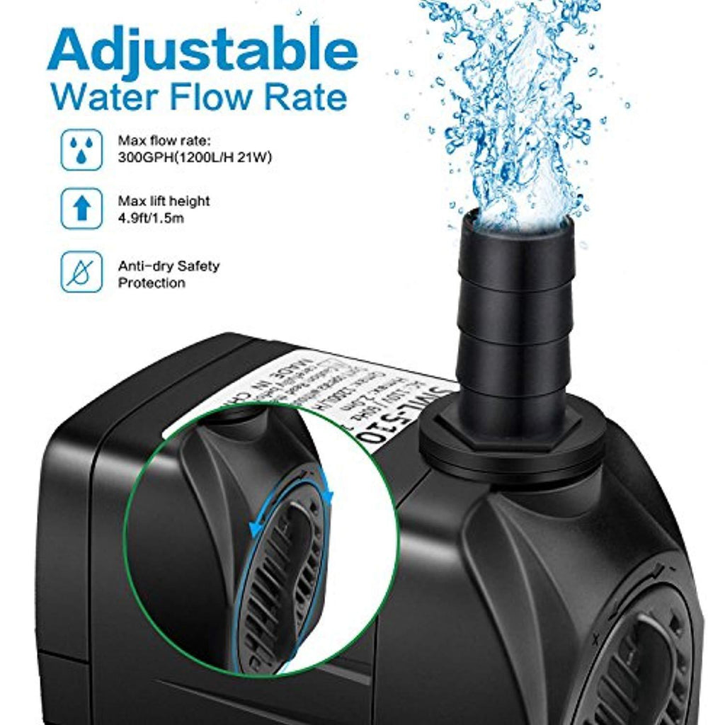 Jhua Water Pump 300GPH (1200L/H, 21W) Submersible Water Pump, Ultra Quiet Fountain Water Pump with 5.9ft Power Cord, 3 Nozzles for Aquarium, Fish Tank, Pond, Statuary, Hydroponics