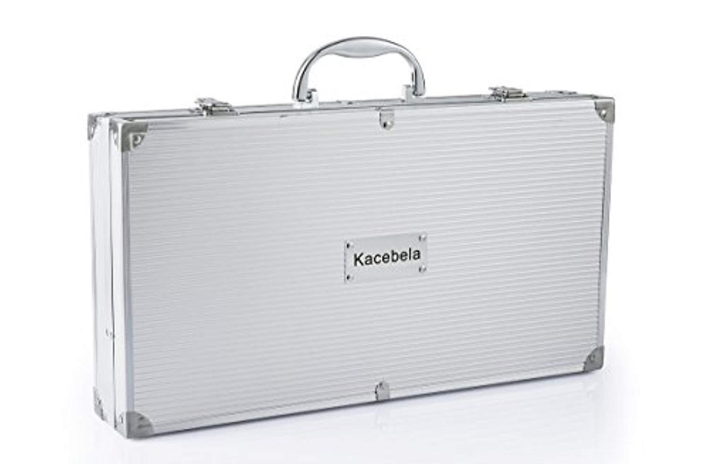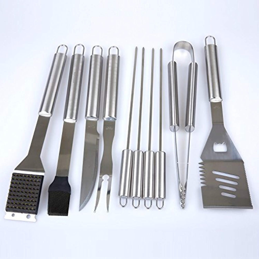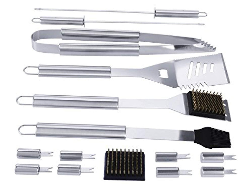 • Barbecue tool includes chef's spatula, fork, knife, grill tong, 8 corn holders, 4 skewers, silicone basting brush, cleaning brush, replacement brush head, aluminum storage case