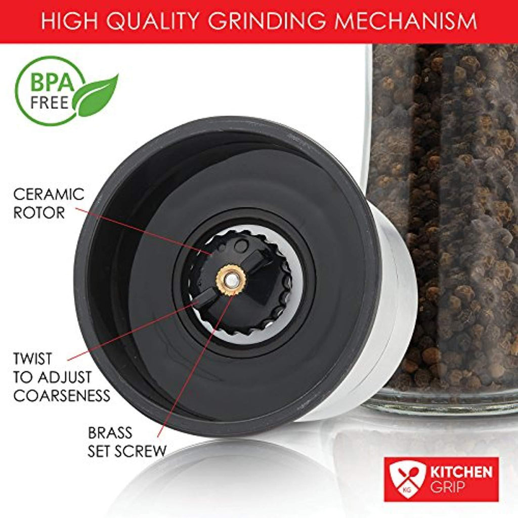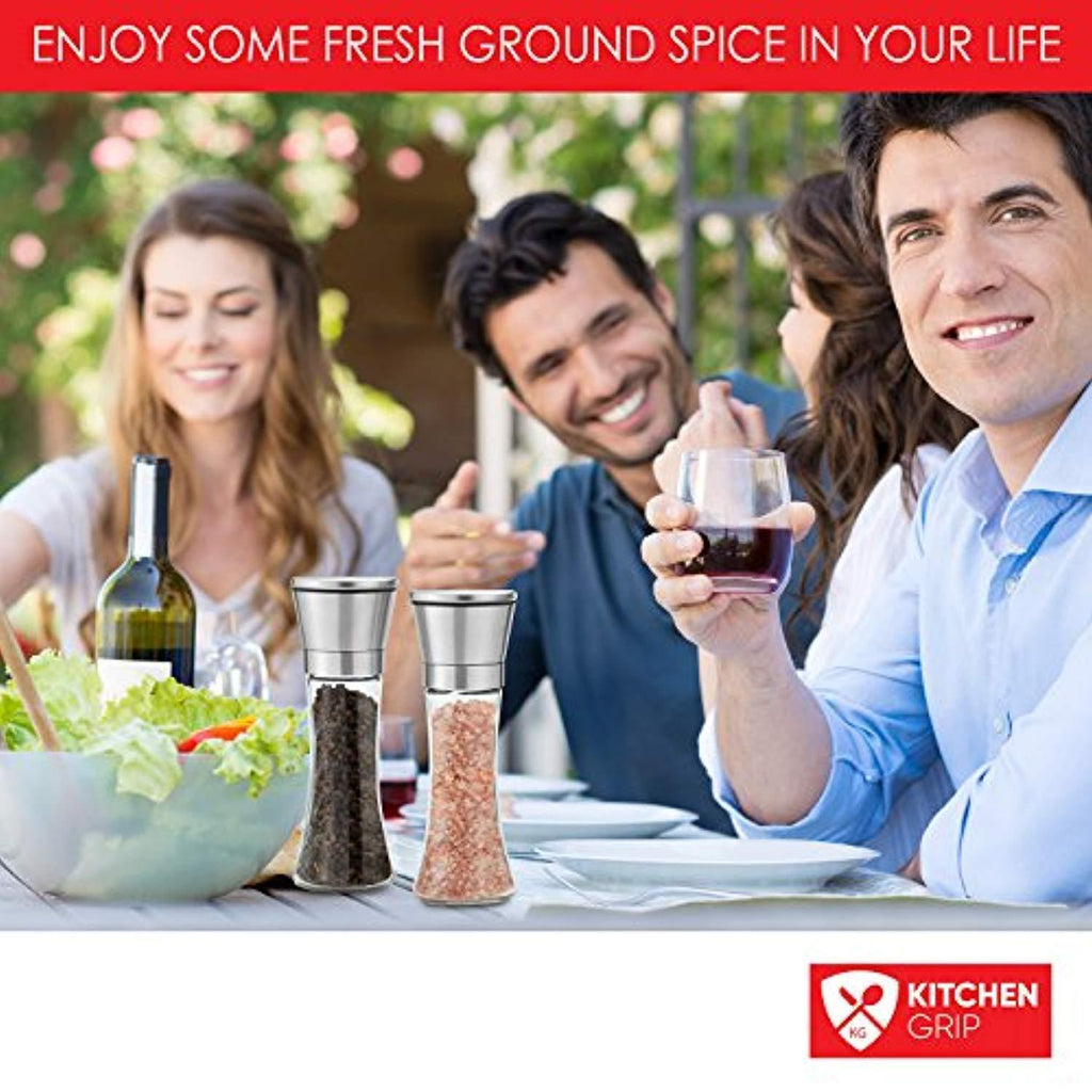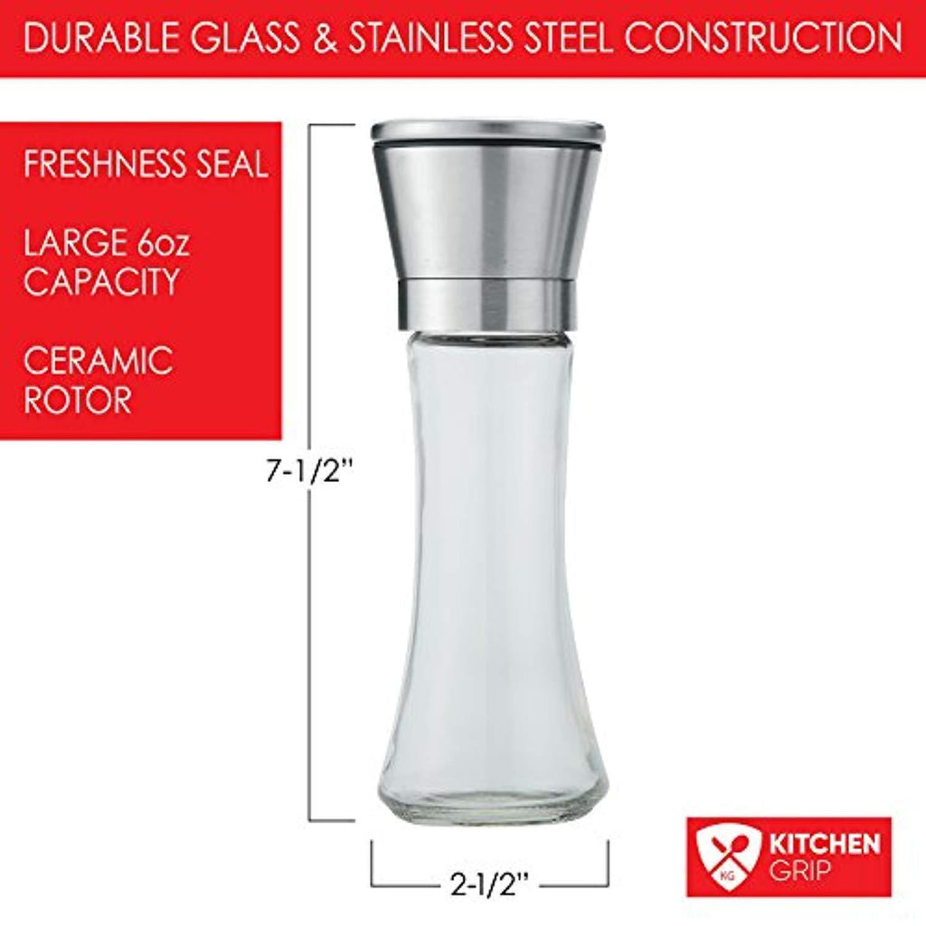 KitchenGrip Salt and Pepper Grinder Set Of 2 - Stainless Steel Top, 6 Oz Glass Tall Body - Salt and Pepper Mill For Fine and Coarse Grinding, 5 Grade Adjustable Ceramic Rotor, Salt and Pepper Shakers