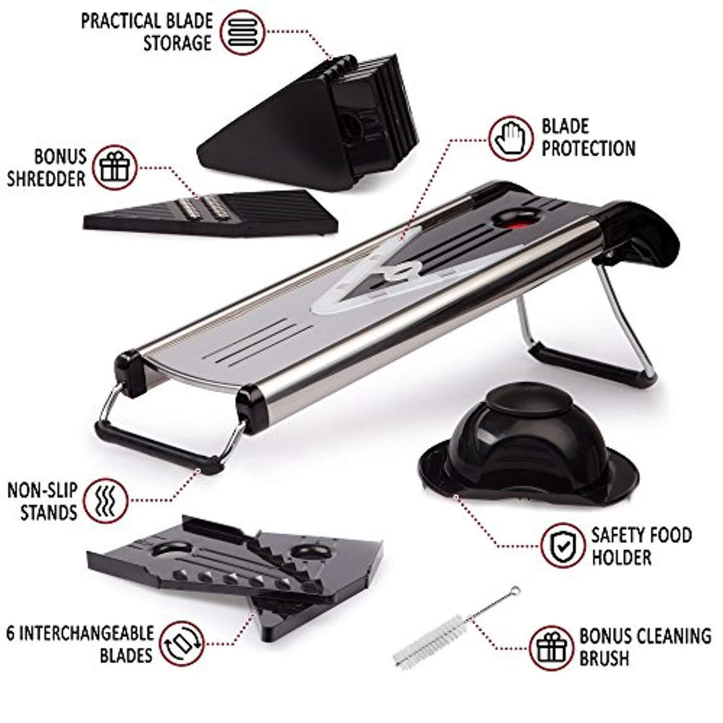 • BONUS CLEANING BRUSH – Forget about the boring cleaning routine after using your mandolin slicer! With the FREE cleaning brush included this veg slicer is so easy to clean that you’ll come to enjoy it!
