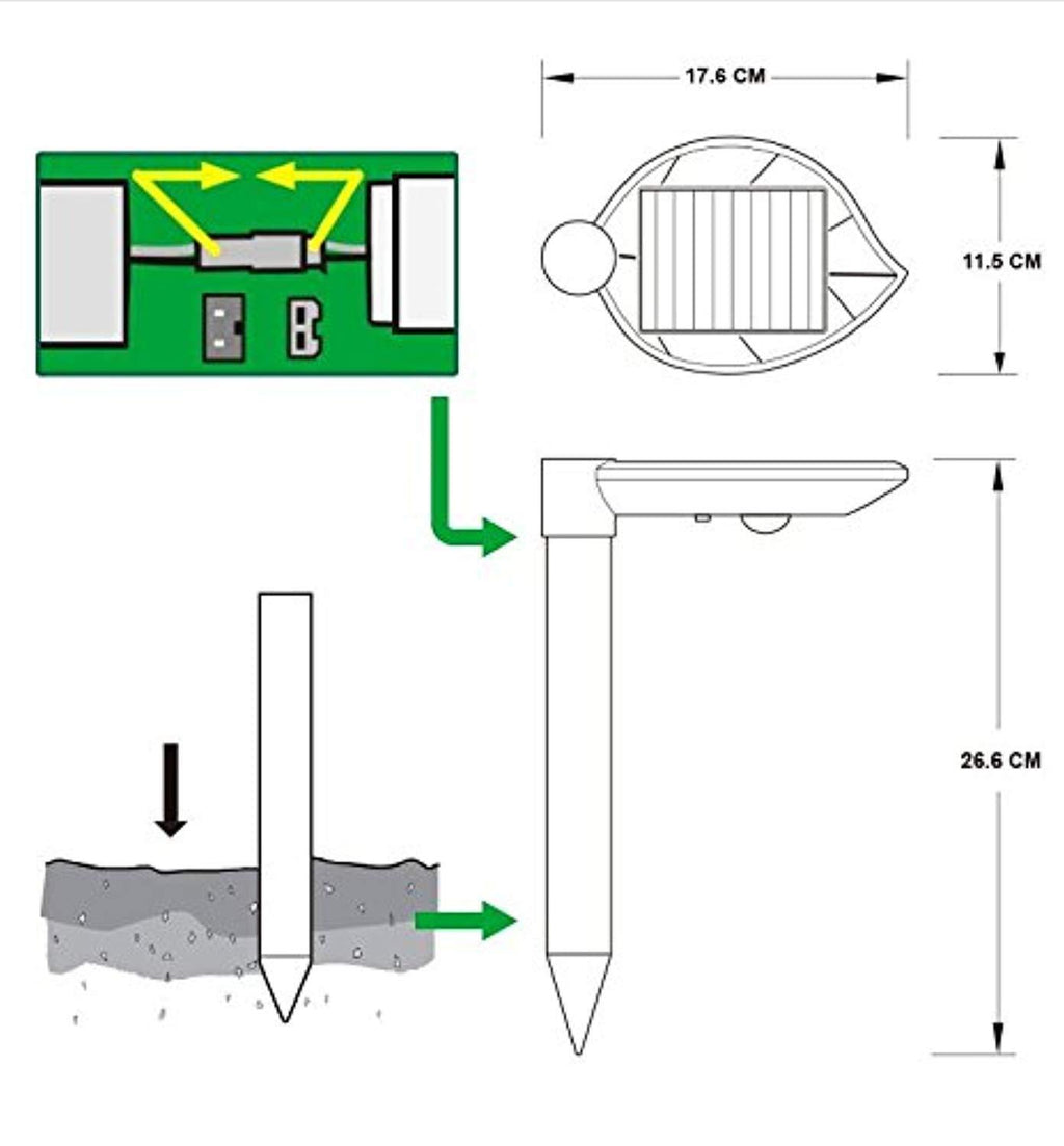 • EASY TO USE: The Ultrasonic snake repeller outdoor is convenience in using. Connect the cable connector from the spike to another connector under the top part, and attach the spike to the top together, then insert spike into the ground and keep the top part at least 4"high from the ground, then turn ON/OFF switch and enjoy the pest free environment you deserve.