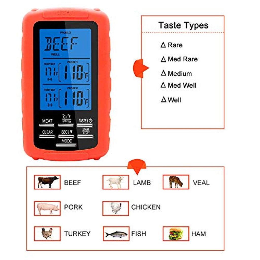 • 【Special Design for Barbecue】Our grill thermometer is specially designed for barbecue. High tech with alarm and flash is used in remote monitors so that you don't have to check the temperature again and again. Once the temperature of meat reaches the preset doneness level, the receiver will beep and the LCD screen backlight color will turn red and flash. Remote Range: Up to 230 feet.