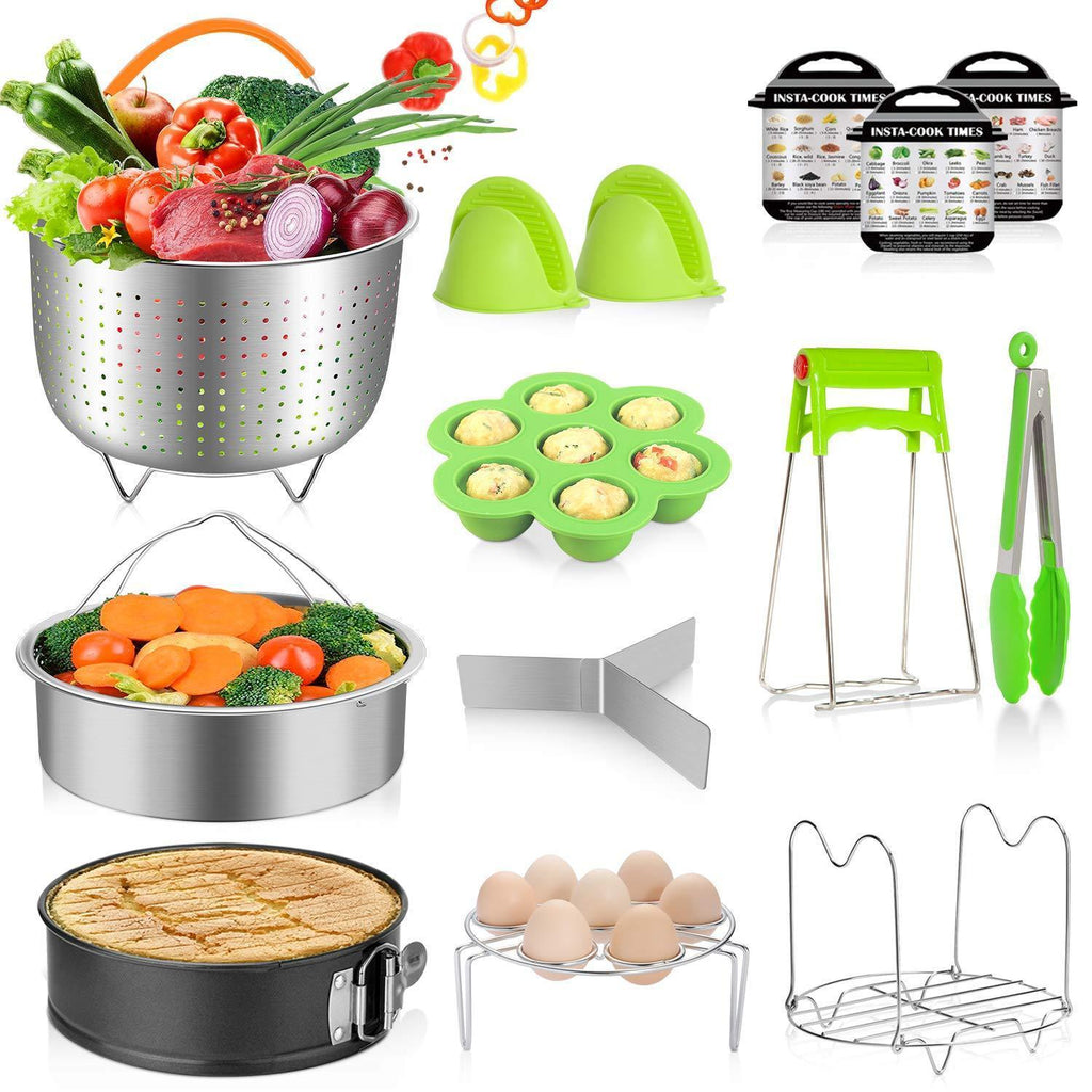 • đŸ„—ă€COMPLETE SET of 14PCS】Our IP Accessories Kits meet all you needs in making the best meals possible. They include 2*SS304 Stainless Steel Steamer Baskets, 1*Springform Pan, 1*Egg Rack, 1*Steamer Rack, 1*Egg Bites Mold, 1*Dish Plate Clip, 1*Kitchen Tong, 1*Food Divide, 2*Silicone Oven Mitts and 3*Magnetic Sheets.