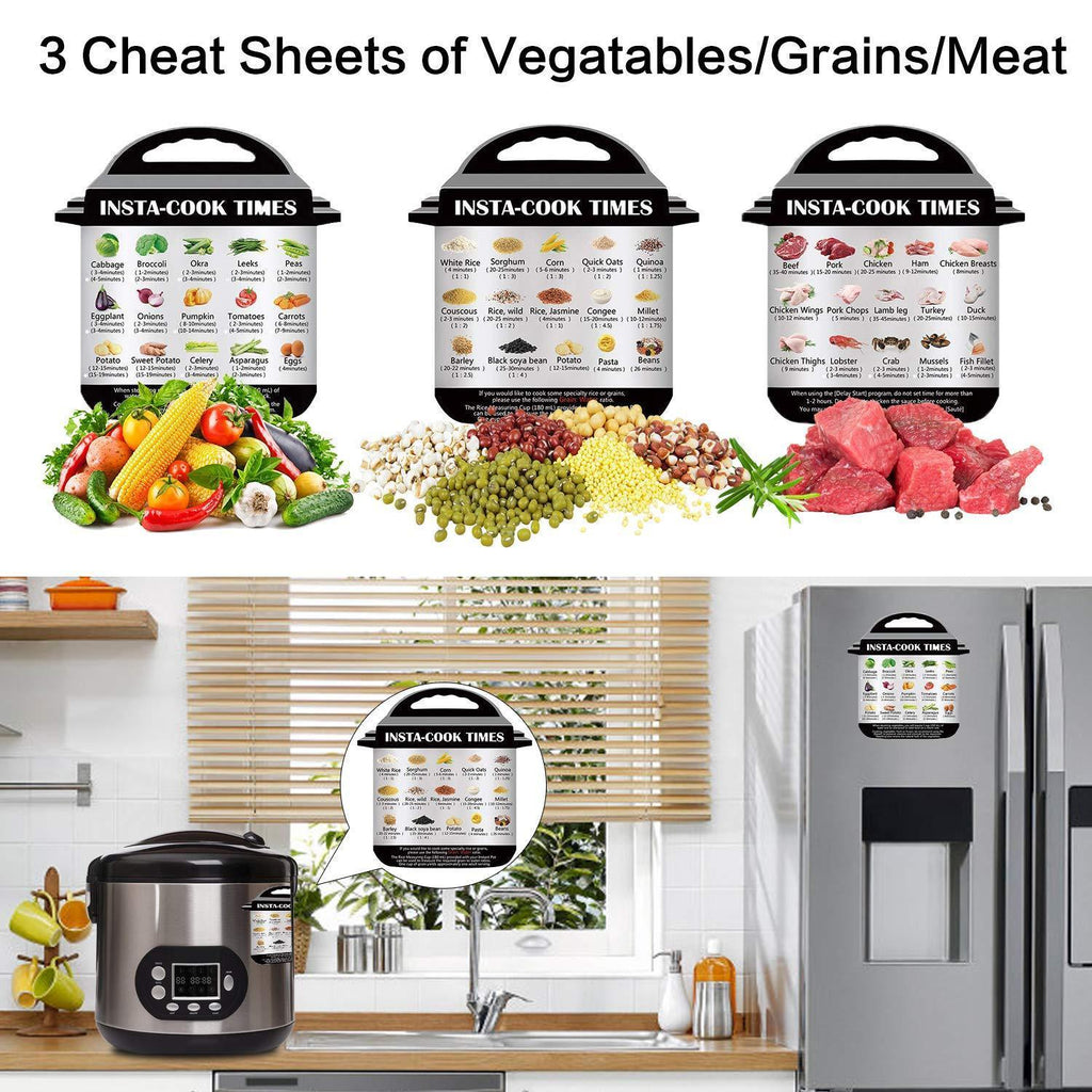 • đŸ„—ă€ENDLESS MEAL POTENTIAL】Our cheat sheet includes cooking times for 45 common foods, no more looking it up on a computer, smartphone or manual. Now it is on a magnet which easily sticks to your appliance, refrigerator or INSTA. This set is compatible with most 5,6,8 Qt Quart instant pot models including IP-DUO50, IP-DUO60, IP-LUX60 and IP-DUO80 and other brand pressure cookers.