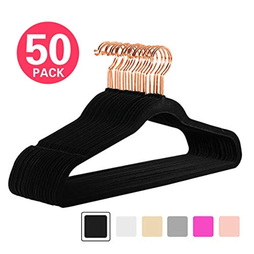 MIZGI Premium Velvet Hangers (Pack of 50) Heavyduty - Non Slip - Velvet Suit Hangers Black - Copper/Rose Gold Hooks,Space Saving Clothes Hangers