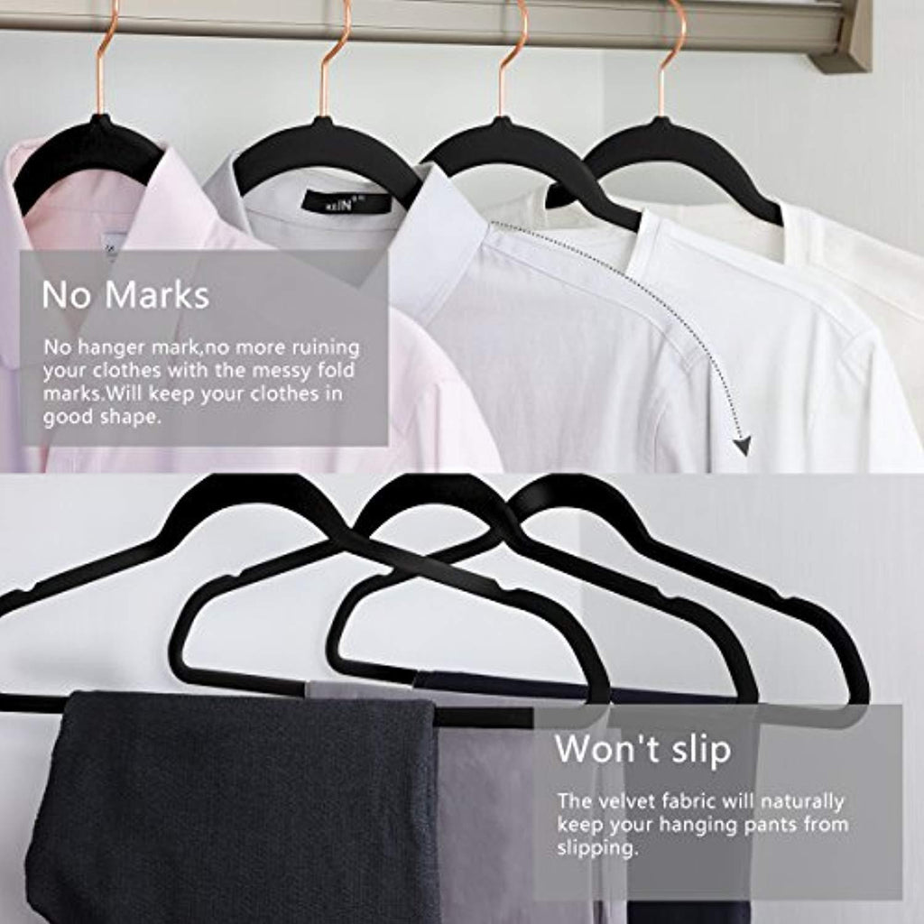 • ✔【Double Maximize Closet Space】 - Designed black velvet hangers Increases Closet space by as much as 50 percent.The slim and sleek design felt hangers works for your closet efficiently, maximizing space and adding class, helping you organize your wardrobe in the most space efficient manner