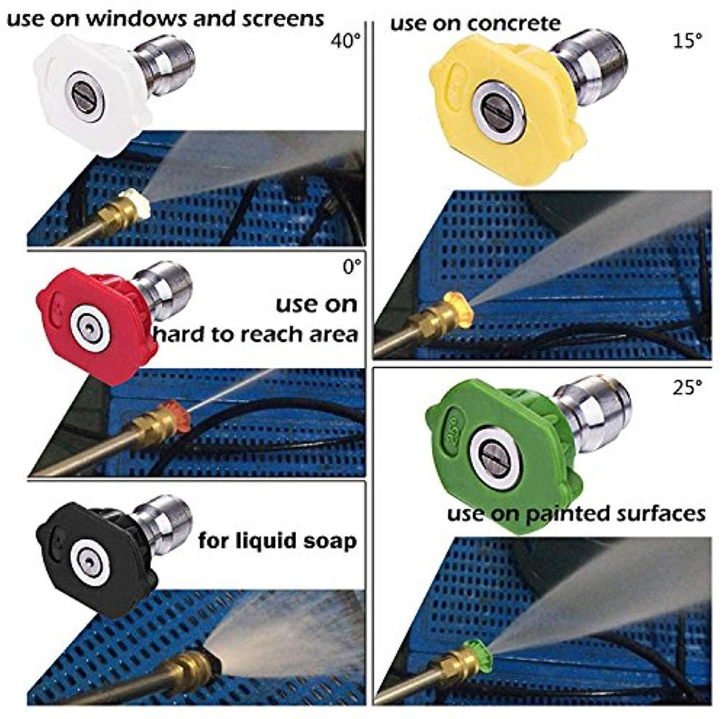 • 【5 Quick-Connect Spray Tips 】- 0º, 15º, 25º, 40ºand soap to tackle light, medium and heavy duty cleaning tasks easily. You can choose high or low pressure to wash various surfaces. 0º- areas that are high and hard to reach; clean crevices in sidewalks or driveways; 15º- use on concrete, brick and other hard surfaces with stubborn stains; 25º- use on painted surfaces, wood siding, fences and lawn mowers; 40º- use on windows and screens; soap- use to spray soaps and detergents.