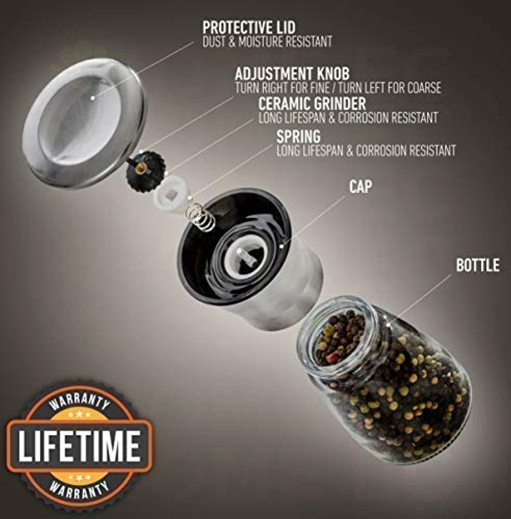 • LIFETIME GUARANTEE : All our salt mills and pepper mills go through rigorous inspection and testing to ensure our customers receive top quality grinder mills. We are confident you will enjoy our refillable spice grinder sets. In the unlikely event that your set is not to your standards, we will replace it for you, or give you your money back, no hassle!