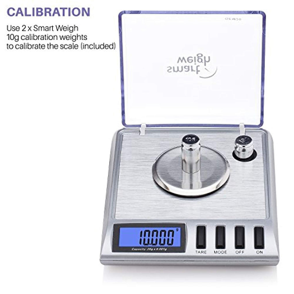 • CALIBRATION WEIGHTS INCLUDED – Although your Smart Weigh scale will arrive calibrated, we have included two Smart weigh 10g calibration weights. Should you notice any inaccuracies in your scale throughout your time using it, simply use these weights and follow the directions to re-calibrate it so you can continue to use your scale accurately.
