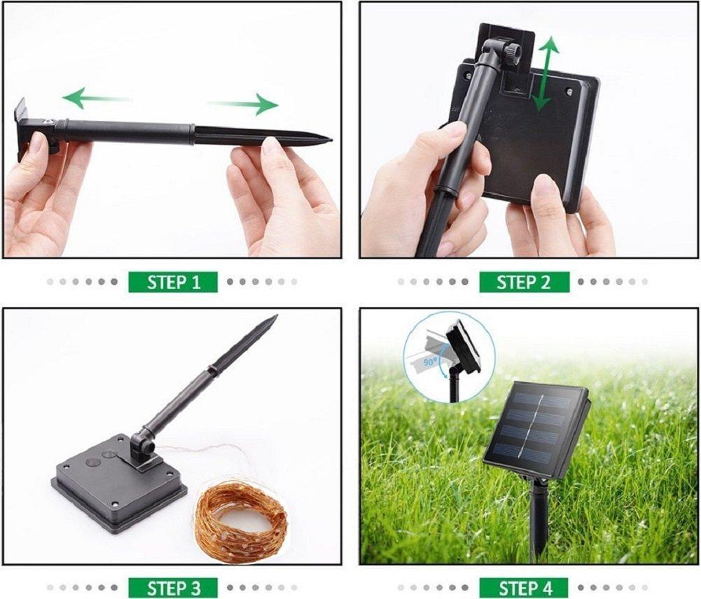 • No wire required, just place the solar panel where there is sunlight and it will work aumatically.The 100 LED starry lights are arranged at a 4” bulb-to- bulb spacing on a water-proof and lacquered 20 ft long and 4mm thick copper wire, which can be bended into multiple shapes; 360 degree viewing angle.