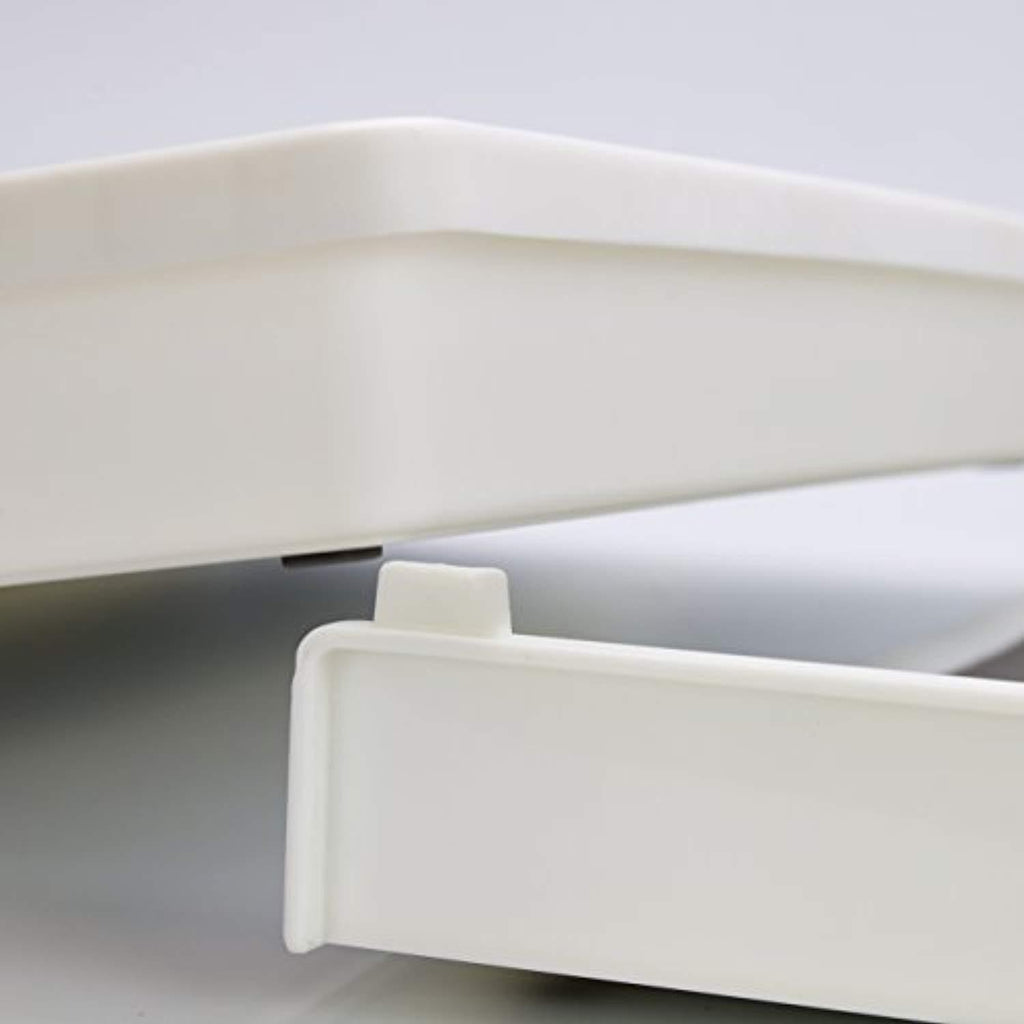 • CONVENIENT DESIGN — Has 5 total sections — Made of durable plastic — White with gray interior — Soft rounded corners — Tray lined with soft grip material to keep flatware in place — Non-slip rubber feet to prevent shifting — Easy to clean — Dishwasher Safe — Entire Unit Measures approximately 23.75” L x 16” W x 2.12” H