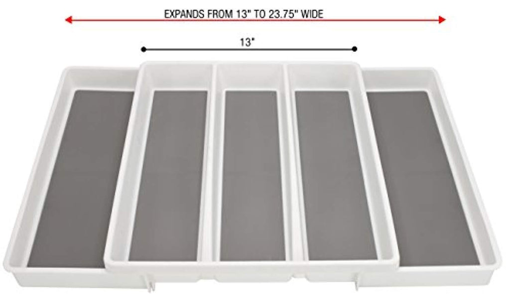 • EXPANDABLE & ADJUSTABLE — Expands from 13" to 23.75" wide — Organizers adjust to the width of your drawer for instant custom fit — Fits easily in most kitchen drawers