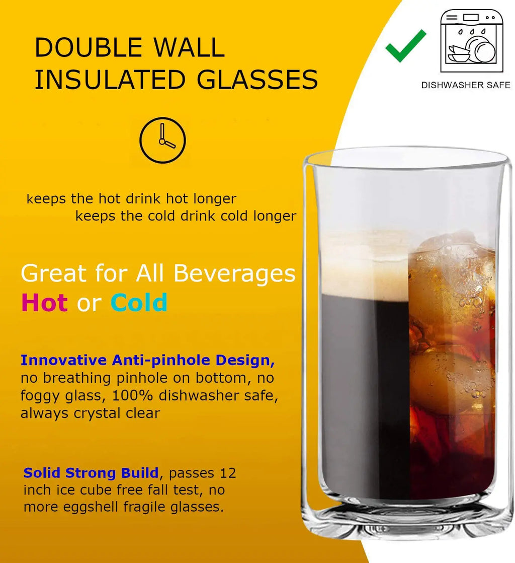 • DOUBLE-WALLED GLASS PROVIDES ADDED INSULATION - Sun's Tea Double-Walled 16oz Glass Cups come equipped with the added insulation needed to keep cold beverages cold and hot drinks hotter for lengthier periods. Now you can sip at your convenience without concerns over your drink getting too cold or hot before you've had time to finish it