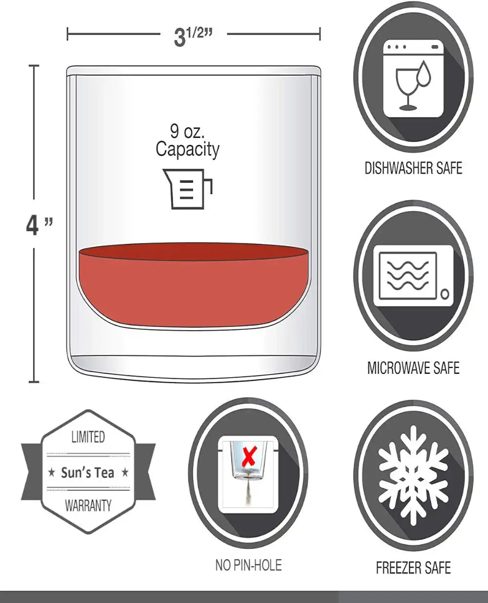 • TOP QUALITY GUARANTEED - We stand behind our Sun’s Tea Double Walled Drinking Glasses and assure you that these are high-quality glasses consisting of borosilicate material. In addition, our glasses have passed the freefall ice ball impact test from 12 inches of height, proving they’re as sturdy and durable as possible. We’re confident you’ll be satisfied with this product and offer a six-month satisfaction guarantee for any potential problems.