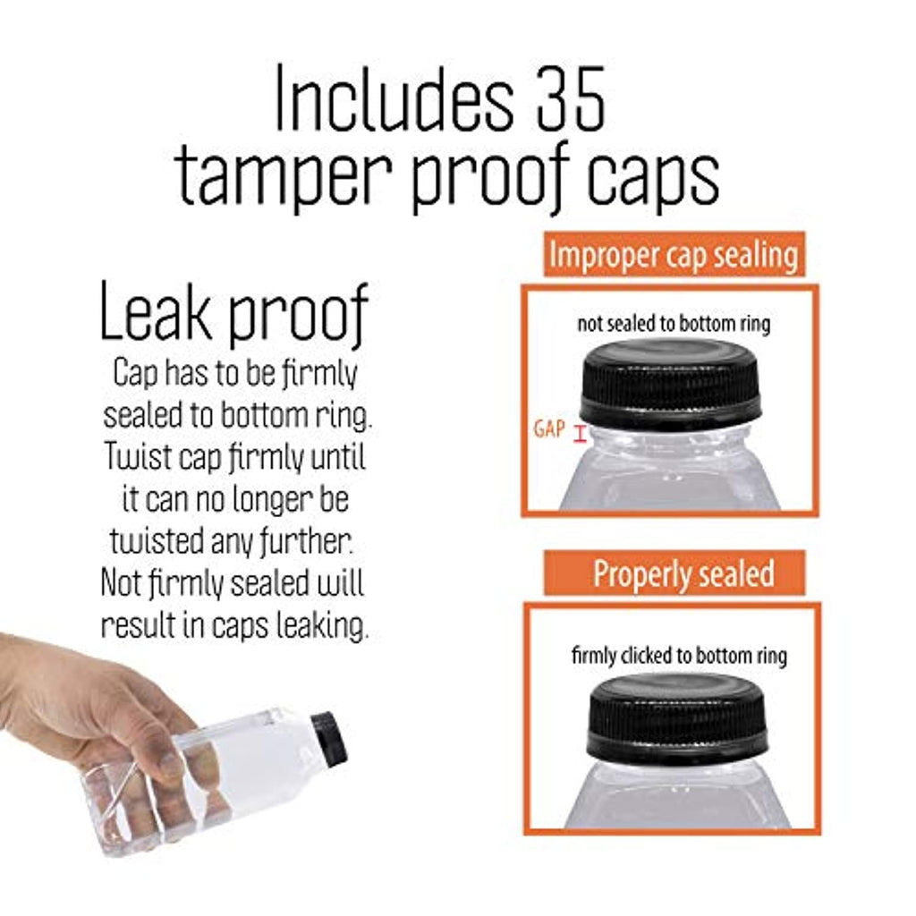 • 35 PK INCLUDES 35 TAMPER SEAL CAPS WITH YOUR PLASTIC JUICE BOTTLES - The tamper evident lids for these plastic bottles with caps will ensure no one drinks from your drink without your knowledge