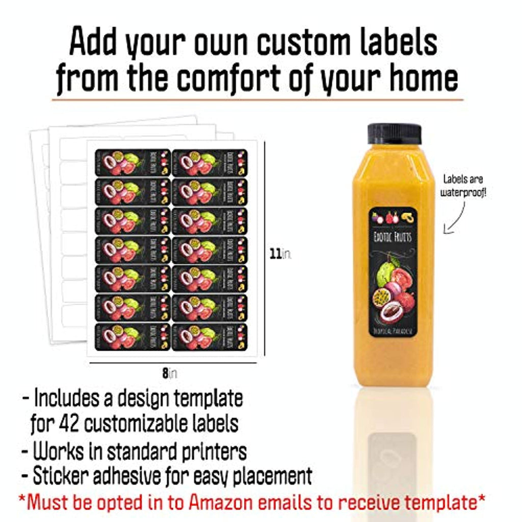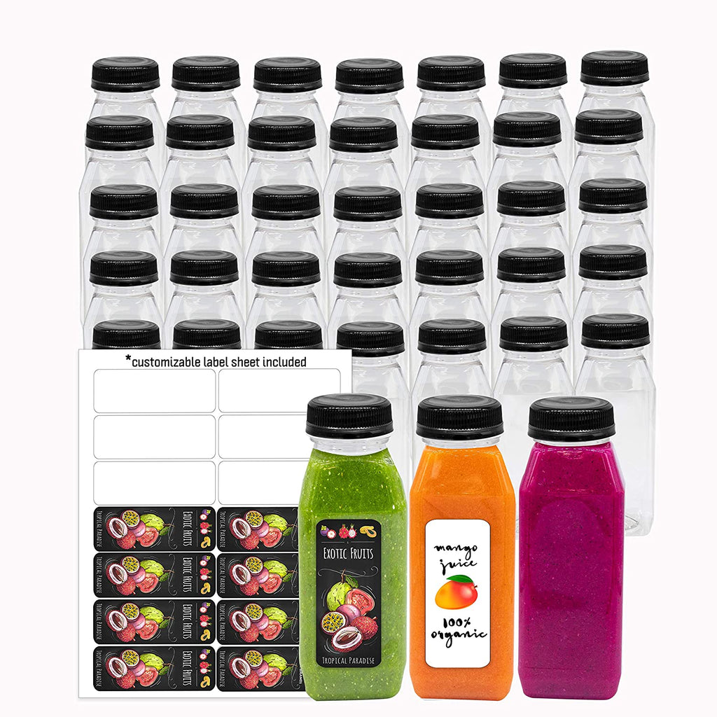 Upper Midland Products Empty PET Plastic Juice Bottles - Pack of 35 Reusable Clear Disposable Milk Bulk Containers with Labels and Tamper Evident Caps (10 OZ, Black)